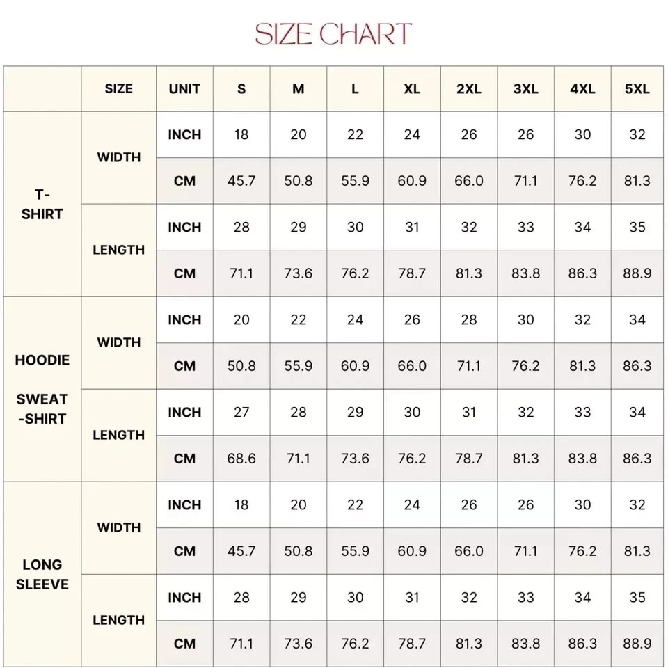 If you are ordering a t-shirt, hoodie, or sweatshirt, please message me or note the color and size you require. We have sizes available from S-5XL and prices are the same for all sizes If you are ordering a digital file, please provide your email address. Note: We want to clarify that a digital file is an electronic file containing a design template that you can use to print the product at home or through a printing service. This is not a physical product that we ship through the mail. To ensure the fastest delivery time, customers in each region will receive their shipments from the warehouse located in that region Delivery Time Customers in the USA, Canada: Shipped from the USA warehouse, delivery within approximately 5-9 business days. Customers in the UK and EU: Shipped from the EU warehouse or UK warehouse, delivery within approximately 4-8 business days. Customers in Australia: Shipped from the Australia warehouse, delivery within approximately 4-8 business days. If you want to buy a Sweatshirt, Hoodie or Tank Top but there are no options on the product listed, please message us for assistance. A. ORDER PLACEMENT INSTRUCTIONS Please review all the provided photos. Select your preferred shirt size. Indicate your color preference. Click the "ADD TO CART" button. You can return to add more items for your family or proceed to checkout. If you have added any additional notes, continue by choosing "Proceed to checkout." Your selected shirt will be prepared for shipping. B. PRODUCT DETAILS A comprehensive size guide can be found among the item photos. The materials used may vary slightly depending on the chosen product type, such as a t-shirt, sweatshirt, or hoodie. Irrespective of the product type, our primary focus remains on comfort and quality. All our products are lightweight, with a fabric weight of 4.5 oz/y² (153 g/m²). We have pre-shrunk them to minimize potential shrinking after washing. To enhance durability, we have included shoulder-to-shoulder taping. Additionally, the quarter-turn design prevents creasing at the center, ensuring a tidy appearance. Feel free to explore our store for the perfect gift suitable for any occasion. FAQs: I JUST PLACED AN ORDER, WHEN WILL IT SHIP? It is noted that your order processing time can be affected if the initial information provided to us is insufficient or incorrect such as inaccurate or incomplete payment; incorrect address information and insufficient product measurements. We seek your understanding and support if it is the case. FEEDBACK Please feel free to contact us if you have any questions about the merchandise. If you are satisfied with the item, please leave a positive feedback and full-star rating for us! Your satisfaction is the most important thing to us. Please contact us first if you could not leave a positive feedback! Just let us know what the problem is, and we are happy to help. CONTACT US If you have any questions or suggestions, please email to us immediately. Your messages will be answered within 24 -48 hours. We shall try our best to solve your problem to your satisfaction. Have A Nice Day! Thank you