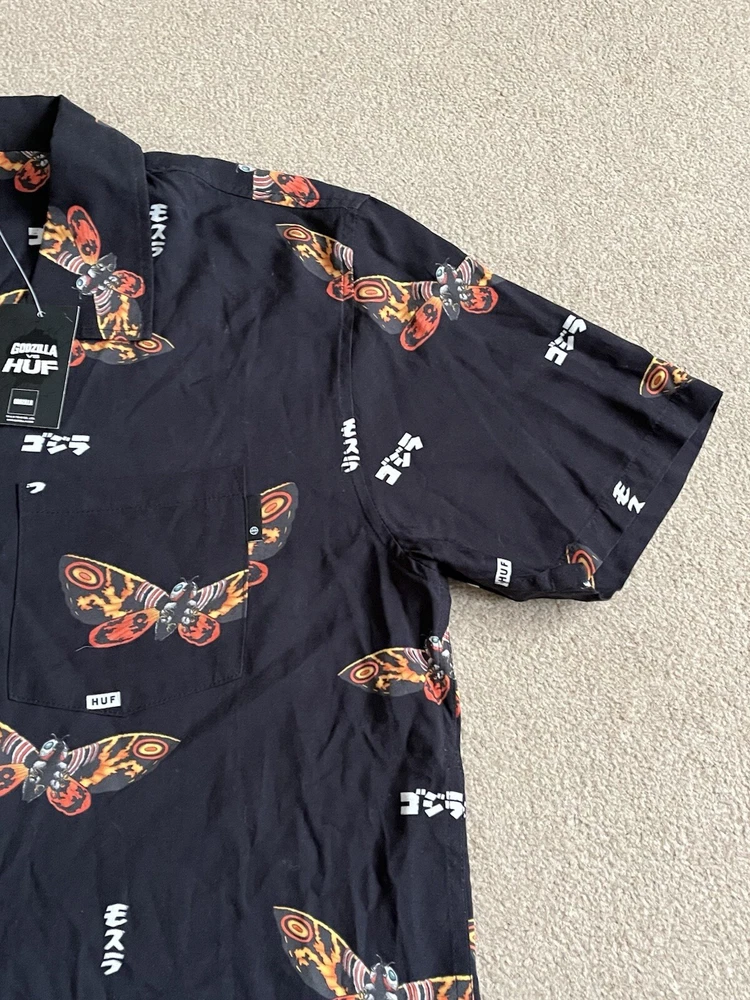 HUF × Godzilla Mothra Resort Button Up Shirt Size Small - NEW RARE. Condition is New with tags. Dispatched with Royal Mail Tracked 48.