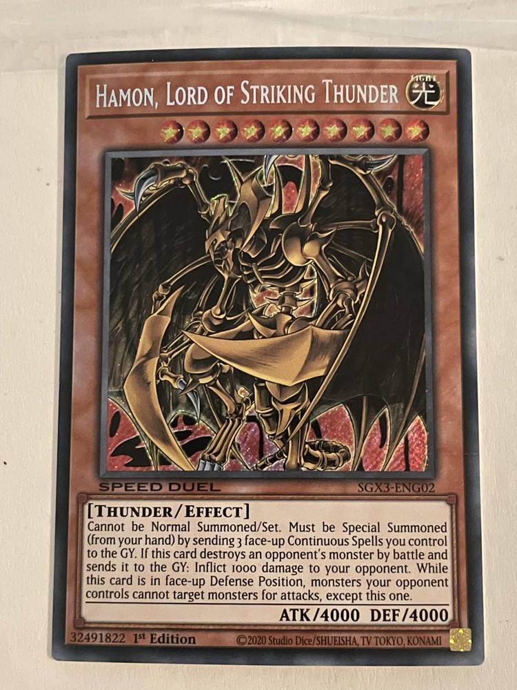 This is a nice example of a Speed Duel GX: Duelists of Shadows #SGX3-ENG02 Hamon, Lord of Striking Thunder Other important information about this card: Secret Rare In 2023 Hamon, Lord of Striking Thunder played for the . Please check out our other listings for more great cards.