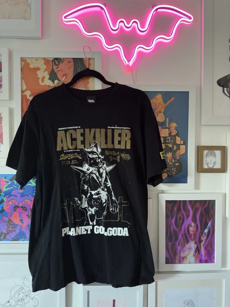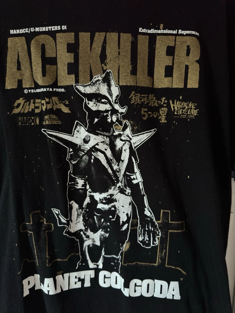 Perfect condition. Metallic ink. Japanese large fits like bigger US medium. This black T-shirt featuring the Ultraman Ace Killer design is perfect for fans of Japanese tokusatsu and kaiju. It is made by the popular brand Hardcore Chocolate, ensuring quality and durability. The shirt is sized as a men's L and has a regular fit. The design features bold colors and intricate details, making it a great addition to any collection. Whether you're a fan of Ultraman, Godzilla, or just love unique and eye-catching T-shirts, this one is sure to impress.