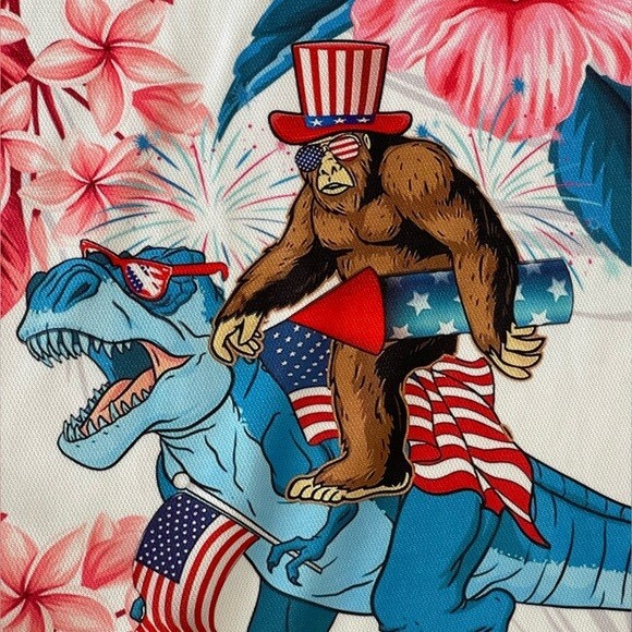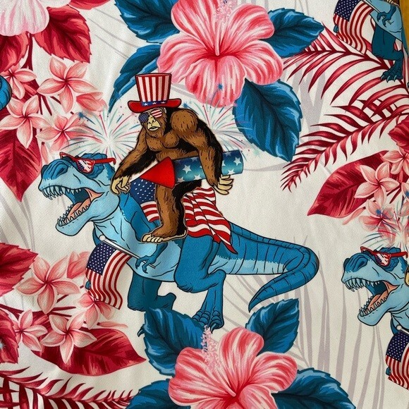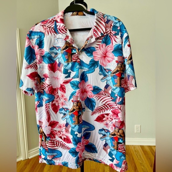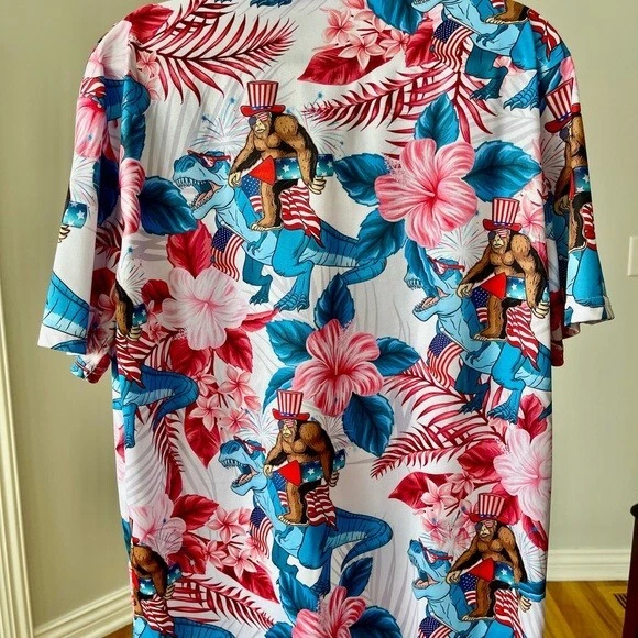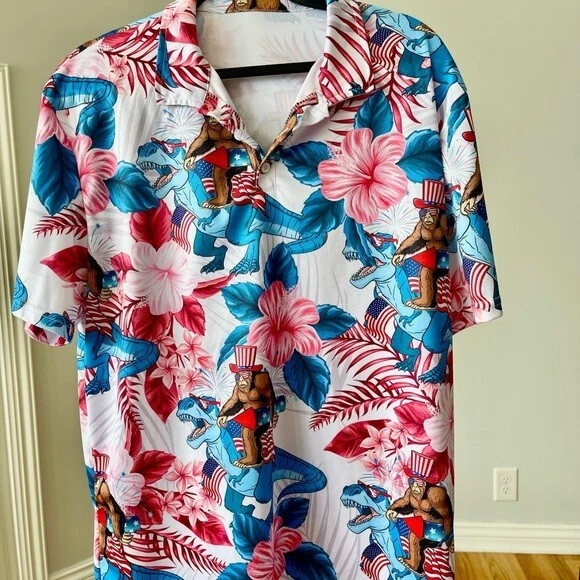 Hawaiian Patriotic King King Godzilla polo shirt holiday July 4th tropical vacation measurements approximate armpit to armpit 23 length 29 2218 e d m