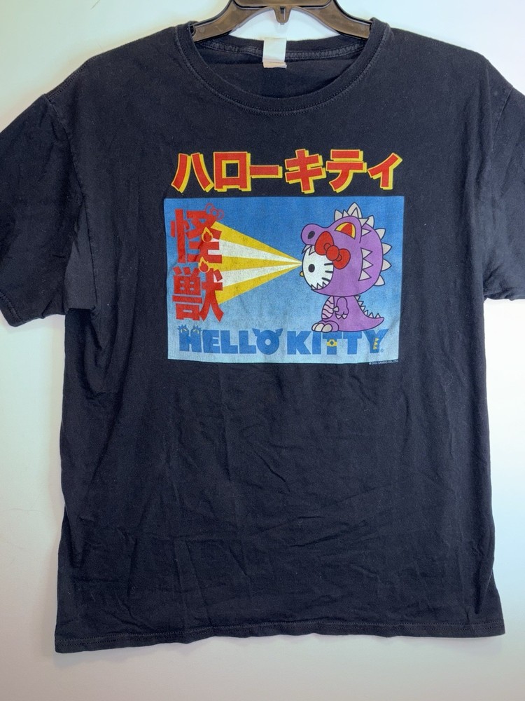 This product is a large black T-shirt featuring a solid pattern with short sleeves and a crew neck. It combines characters from Godzilla and Hello Kitty in a unique design that appeals to fans of anime, Japanese culture, and colorful graphics. Made of cotton with a canvas fabric type, this T-shirt is machine washable and suitable for all seasons, making it a versatile and fun addition to any wardrobe. The shirt is branded by Fruit of the Loom and offers a regular fit, perfect for men who appreciate indie and kawaii aesthetics.