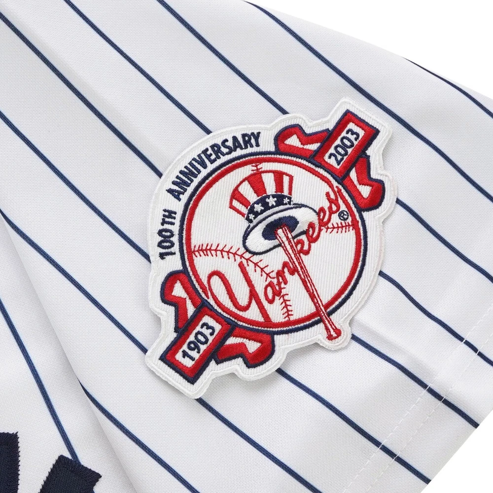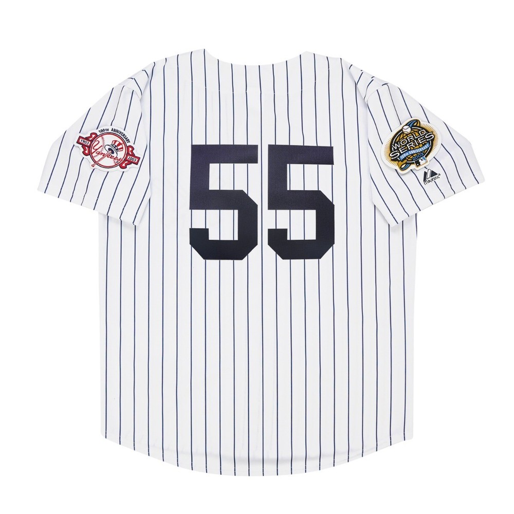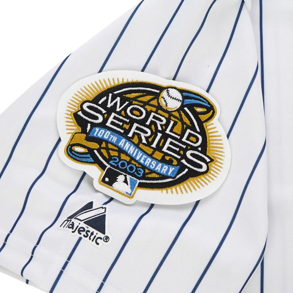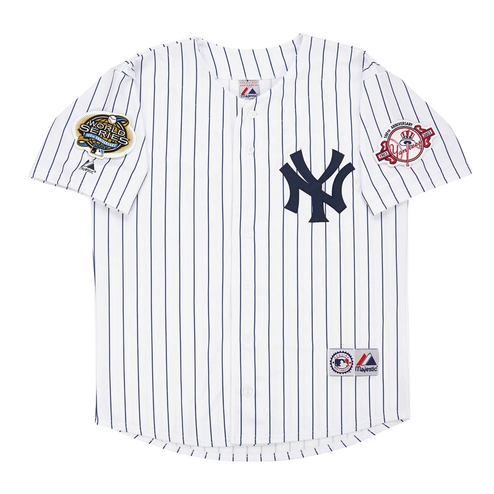 ** The winner will receive the exact item shown in the listing 100% Polyester fabric Felt applique Majestic logo on right sleeve Imported Jock tag Full Button down Jersey Rounded hem Tackle Twill Sewn Twill lettering & number Official 2003 World Series Patch sewn on the right sleeve Official Yankees 100th Anniversary Patch sewn on the left sleeve inkfrog terapeak