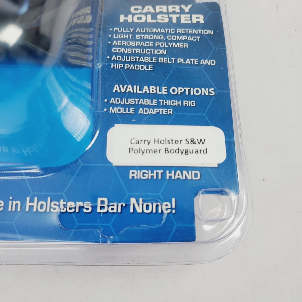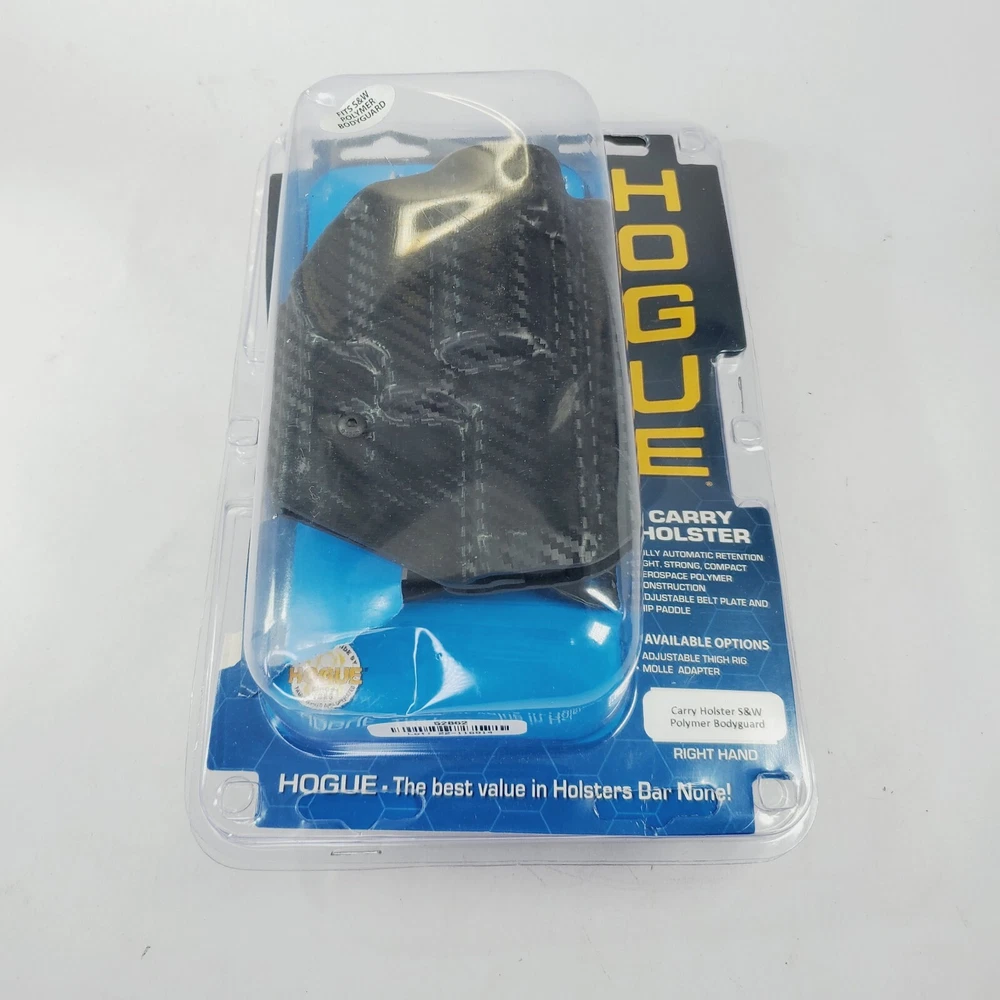 Hogue Paddle or OWB Holster. Free shipping. Condition is New with tags. Fits Hogue carry Carbon Fiber Paddle OWB Holster for right S&W POLYMER BODYGUARD .38 Hogue holsters offer unparalleled protection without compromising performance and comfort. Heavy duty construction ensures guaranteed performance in any environment and any condition. Hogue's patented Automatic Retention System (ARS) provides an extra level of security over the standard, open-top, friction style holsters. The unique thumb activated unlocking mechanism allows for a quick, smooth deployment. ARS Stage 1 Carry and ARS Stage 2 Duty holsters can be mounted in a variety and positions and locations. CHECK OUT MY OTHER STUFF! Most holsters I sell are molded from the exact model mold which makes errors nonexistent. If you are buying a new or good condition all LEATHER holster from me it will need breaking in. Different brands require more break in than others. Breaking in a good leather holster is mandatory for it to function; when it is new you may not be able to draw the firearm from it as quickly as you might need it. After you have checked the holster for suitability and broken it in correctly, then your can bet your life that it will hold the gun securely, protect the gun from inadvertent access, and allow you to get the gun quickly when you need it. There are plenty of articles online for breaking in a leather holster. I get many messages about the thumb snap (if applicable). The thumb snap is difficult to get snapped on many holsters when you first get it. You have to work leather. Bottom line, if you get it and it is not fitting the high percentage of time is that you have not seated it fully or worked it fully. One method I enjoy is wrapping the pistol, unloaded, in a plastic wrap or bag and stuffing that into the holster overnight or for a few days. If you are purchasing a holster please make sure you have a proper gun belt. All holsters should be worn with a proper gun belt. Also, all holsters should be worn with the belt fully tightened, but not uncomfortable. Never wear your holster loose, sagging pants, or without a proper gun belt. Thanks, Big MikeFor 99% of the holsters and accessories I sell I am not the manufacturer so there are no misrepresentations. I am not responsible for negligence. I am reselling items either in new or used condition that I don't want as part of my holster collection. I am NOT responsible for your negligence.