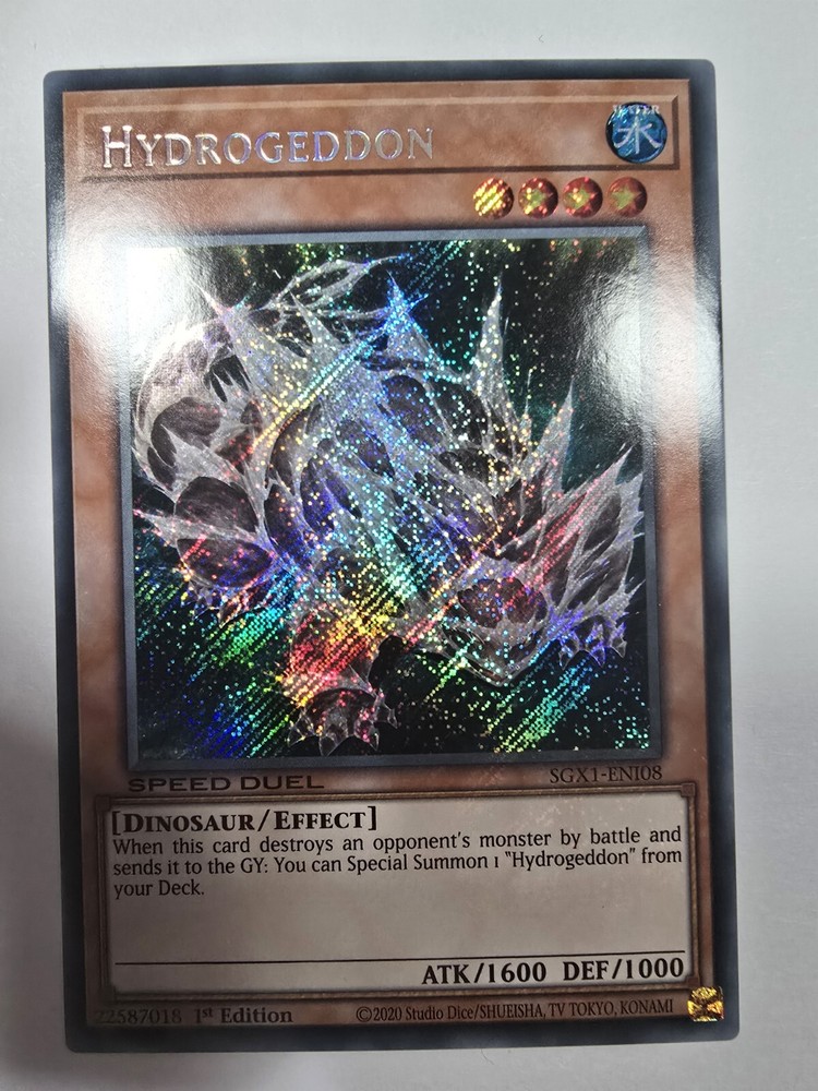 This highly sought-after card, Hydrogeddon, is a must-have for any Yu-Gi-Oh! TCG collector. With a Secret Rare rarity and 1st Edition features, this card is a true gem. It comes from the Speed Duel GX: Duel Academy Box set and has the card number SGX1-ENI08. The card boasts an impressive 1600 attack power and 1000 defense/toughness, making it a formidable addition to any deck. Its English language and the character of the box add to its charm. Manufactured by Konami, this card is sure to be a valuable addition to any collection. Sleeved, toploader, sleeve bag, and shipped in a envelope. Make sure to check out the page for playsets, misprints, tcg accessories, and hundreds of singles across many card games! Thanks!