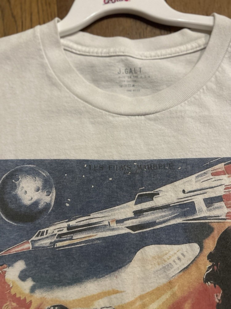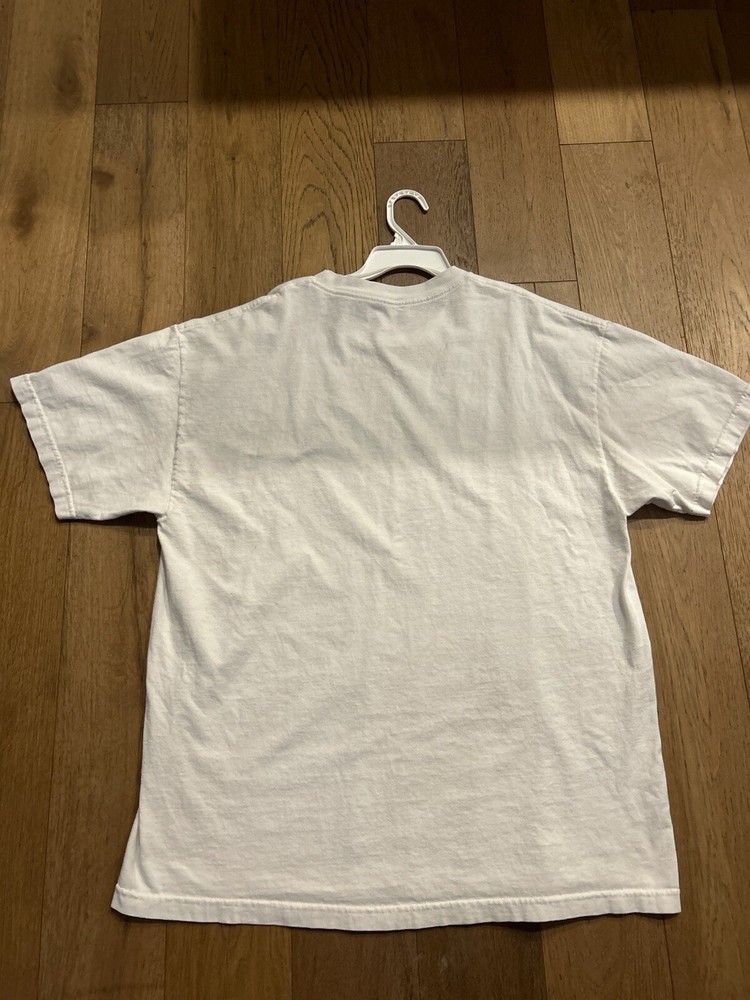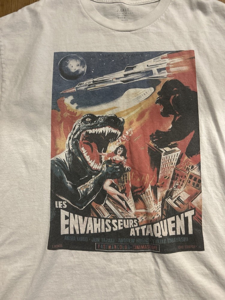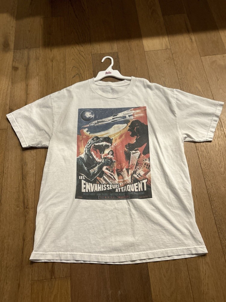 This white T-shirt features a movie poster design with Godzilla and Kong. Made of cotton, it has a crew neck and short sleeves. The regular fit shirt is matchine washable and suitable for all seasons. The brand is PacSun, and it is one size fits all. Great for fans of monster movies like Godzilla and Kong.