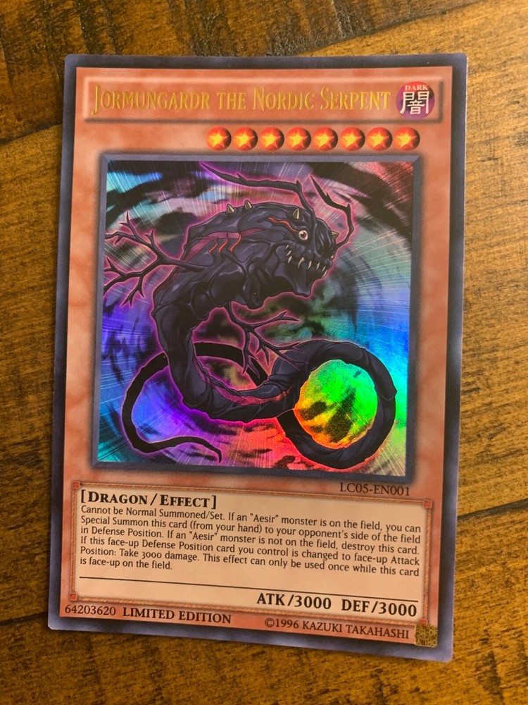 Hello! You are buying one Jormungardr the Nordic Serpent LC05-EN001 Limited Edition Ultra Rare in near-mint condition. As a thank you for buying from me, I will throw in two free Yugioh commons! Thank you so much for looking, have a great day! If there is ever an issue, please let me know so I can do whatever I can to resolve it! Please check out my other items! I have many more single cards!