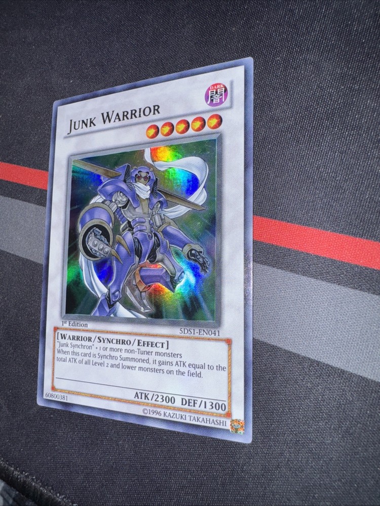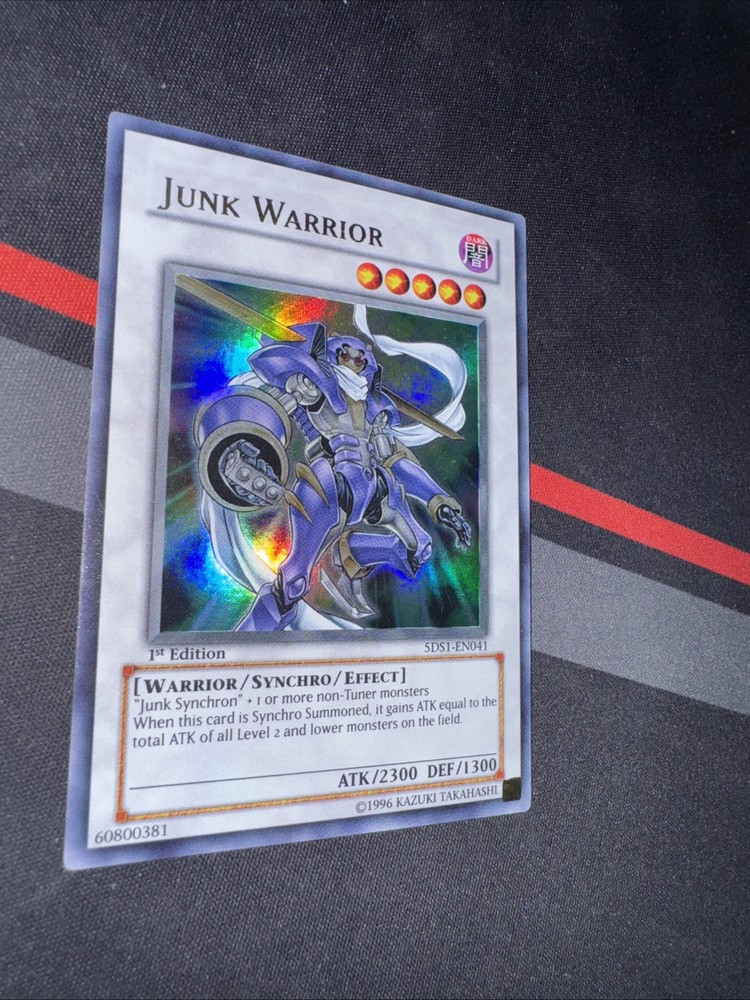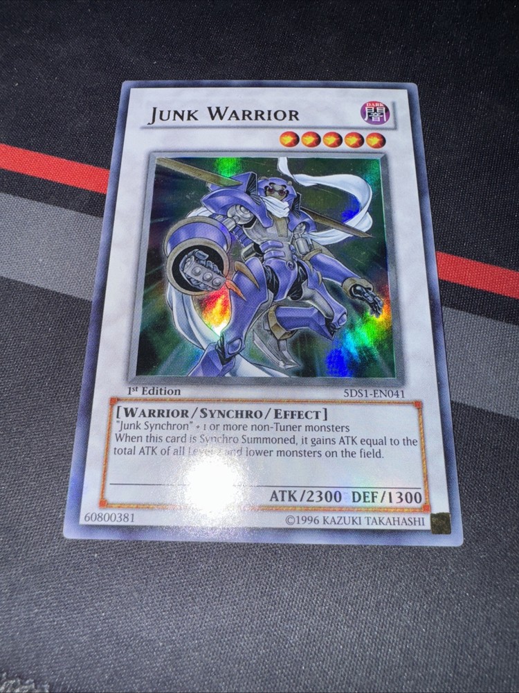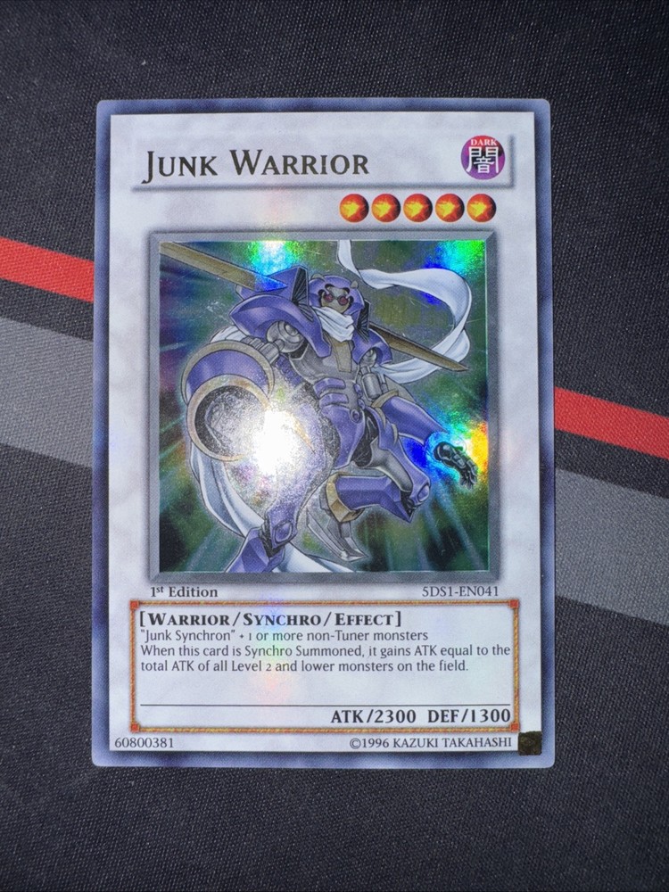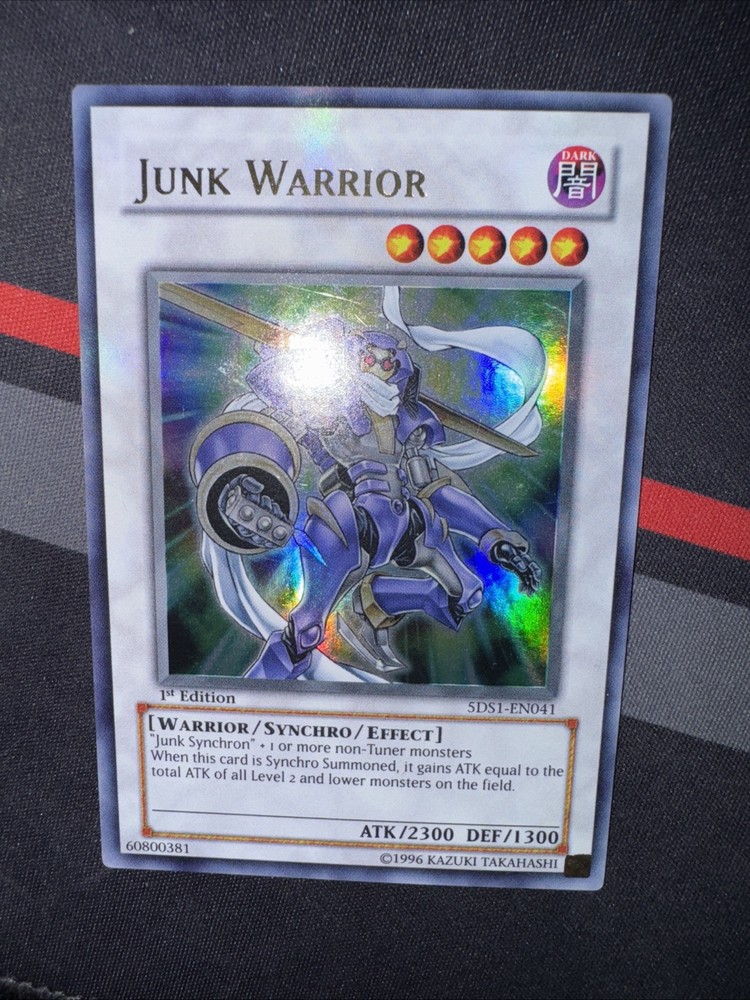 Junk Warrior is an Ultra Rare card from the Yu-Gi-Oh! TCG, part of the 5d's 2008 Starter Deck. This Warrior-Type monster has 2300 Attack and 1300 Defense points, making it a powerful addition to any deck. It is a 1st Edition card with the ability to tune with other monsters as an Effect Tuner card.