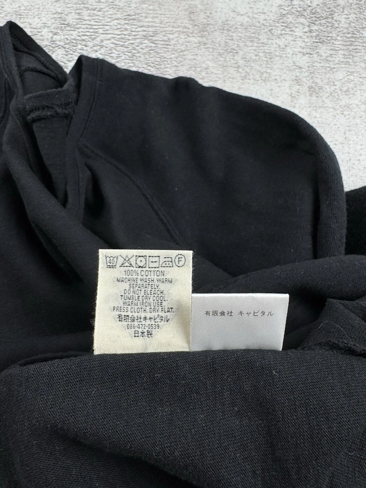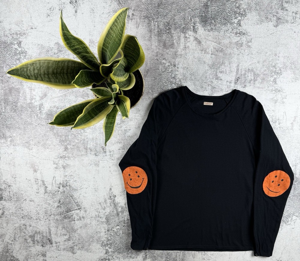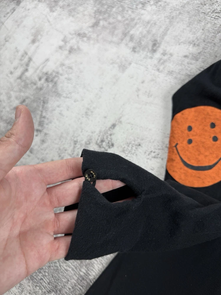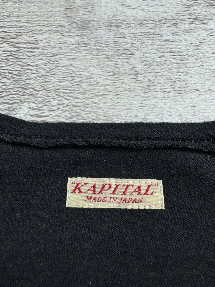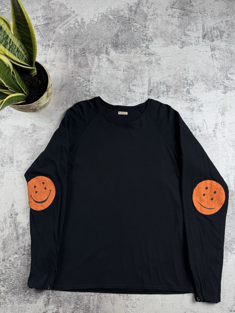 This KAPITAL Smiley Patch x Gauze Tenjiku Chef Long-Sleeve Black Japan T Shirt Jersey is a limited edition piece that is perfect for any fan of Japanese streetwear. The shirt features a heart-shaped graphic print with a variety of characters from comics, cartoons, and movies such as Captain America, Mickey Mouse, and Iron Man. The shirt is made of cotton and has a crew neck and long sleeves. This T-shirt is machine washable and has a regular fit. It is available in size L and is suitable for all seasons. The shirt has a variety of features such as crochet, lightweight, and quick dry. It also has a vintage look and feel, with a canvas fabric type and a stylish designer hip hop theme. This shirt is perfect for anyone who loves to showcase their love for comics, cartoons, and movies while staying comfortable and stylish.