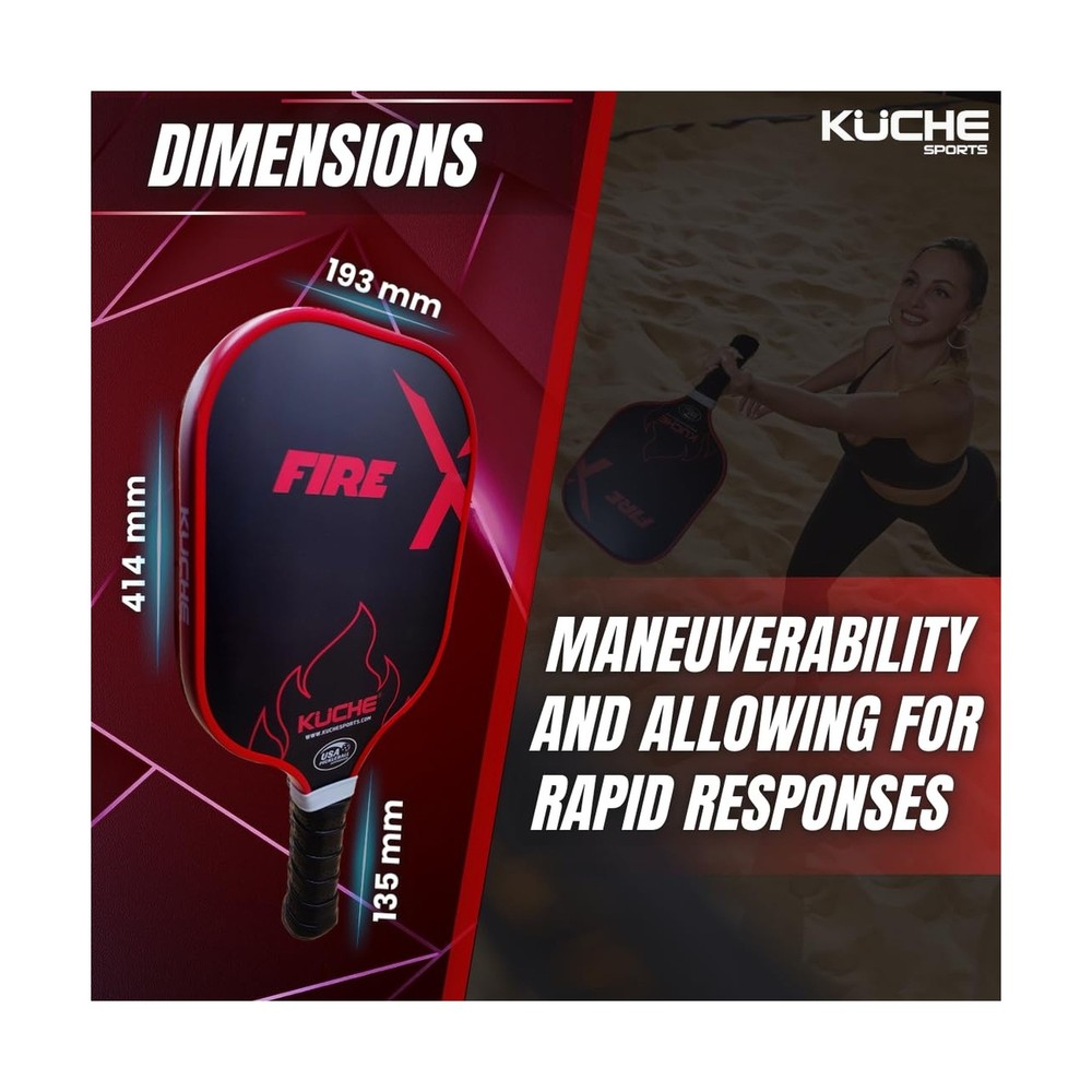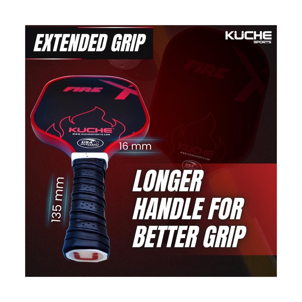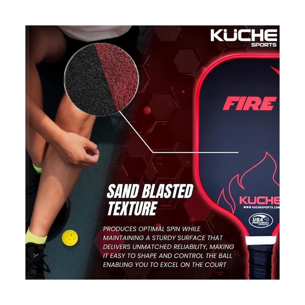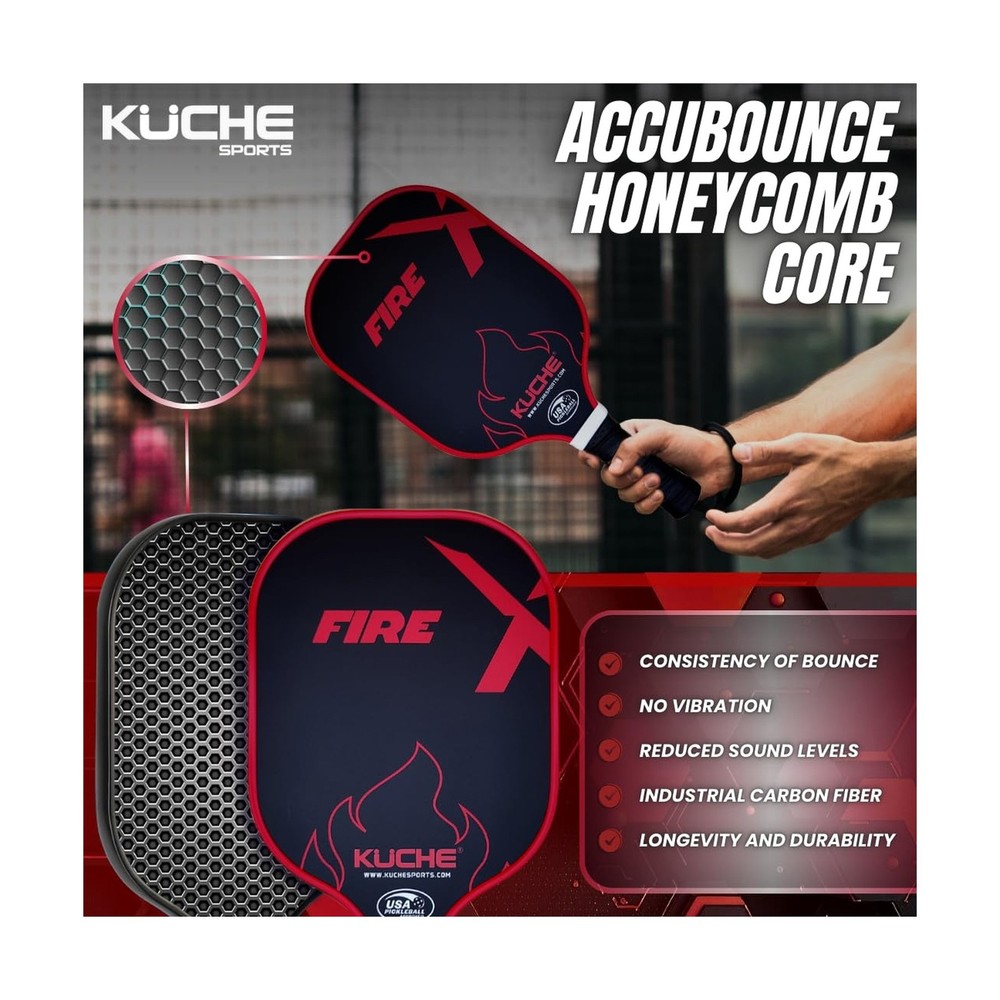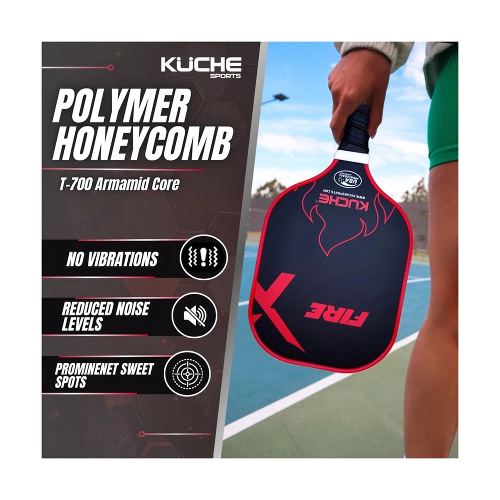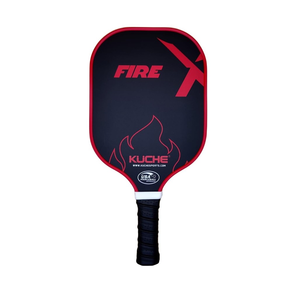 KUCHE FIRE T-700 Carbon Fiber Pickleball Paddle - Polymer Honeycomb Core -16MM Thick Sandblasted Surface for Spin & Control - USAPA Approved Pickleball Equipment for Men & Women - Buy Now with Fast Shipping! KUCHE FIRE T-700 Carbon Fiber Pickleball Paddle - Polymer Honeycomb Core -16MM Thick Sandblasted Surface for Spin & Control - USAPA Approved Pickleball Equipment for Men & Women Product Details Size: One Size Brand: KÜCHE Grip Size: 4.5 Inch Sport: Pickleball Material: Carbon Fiber Skill Level: Intermediate Frame Material: Carbon Fiber Item Weight: 8.5 Ounces Age Range (Description): All Ages UPC Size: One Size Brand: KÜCHE Grip Size: 4.5 Inch Sport: Pickleball Material: Carbon Fiber Skill Level: Intermediate Frame Material: Carbon Fiber Item Weight: 8.5 Ounces Age Range (Description): All Ages UPC: 197644649532 Sport Racket String Installation: Unstrung Shaft Material: Carbon Fiber Item Package Dimensions L x W x H: 15.76 x 7.92 x 0.63 inches Package Weight: 8.5 Ounces Item Dimensions LxWxH: 15.76 x 7.92 x 0.63 inches Brand Name: KÜCHE Color: Black, Red Manufacturer: Kuche Sports LLC Model Year: 2024 Date First Available: August 14, 2024 Key Features ✅ USAPA APPROVED FOR TOURNAMENT PLAY: Kuche Fire pickleball paddles are officially approved by USAPA, ensuring safety, quality, and professionalism for competitive and recreational play. Take your game to the next level. ✅ BUILT TO LAST: Polymer honeycomb core T700 Carbon Fiber experience exceptional durability with a robust honeycomb core and wear-resistant carbon fiber face. This paddle is engineered to withstand intense matches without compromising performance. ✅ SPIN-OPTIMIZED TEXTURE: Sandblasted carbon fiber dominates your game with superior spin capability. The textured surface provides enhanced grip on the ball, allowing for strategic shot placement and advanced control during play. ✅ POWER MEETS PRECISION: T700 carbon fiber surface achieves unmatched power and precision with a durable carbon fiber surface. The sandblasted texture enhances spin control, perfect for advanced shots like topspin and cut drives. ✅ BALANCED PERFORMANCE: At 8.5 oz, this lightweight paddle offers the perfect balance of power and agility. Designed for quick net reactions and strong baseline hits, it delivers precision, control, and performance for all skill levels. Ideal for fast reactions, powerful hits, and competitive play. Product Description