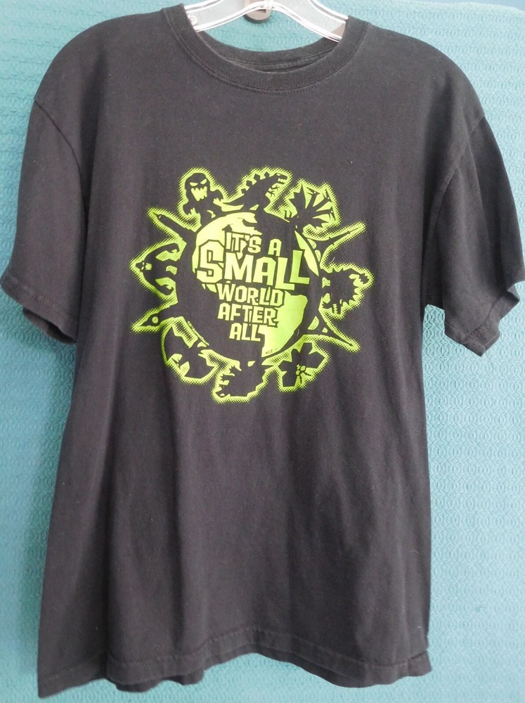 Kaiju "It's A Small World After All" Ma rching Around Globe Image T Shirt Medium Celebrate your love of all things kaiju with this outstanding shirt. Featuring a series of kaiju marching around the globe, with the words "it's A Small World After All" displayed in a fluorescent green ink. Haha, nicely done, pun-wise. Design depicts Godzilla, King Ghiddorah, Mothra, Rodan and others, marching around global landmarks Tower of London, Tokyo Tower, Eiffel Tower and Empire State Building. Manufactured in Haiti using a Gildan brand shirt. 100% cotton, medium size. Black (even though my camera shows some in grey, its black). Item pictured is the item being shipped. Sold as-is, no returns, from a smoke and pet-free home. Buyer to pay $8.00 USPS Ground Advantage shipping.