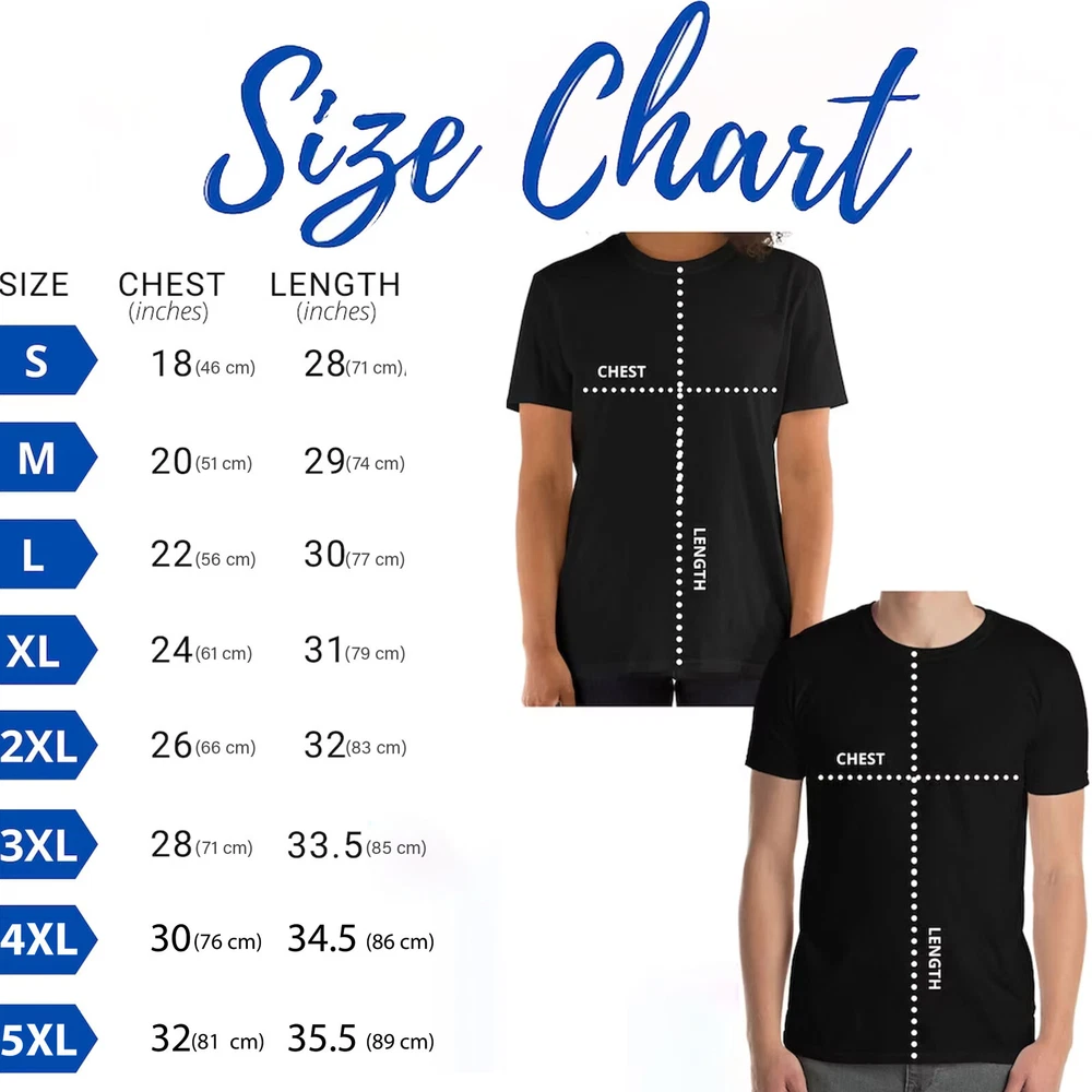 PREMIUM QUALITY T-SHIRTS For any issues with your order or if you have not received your item, please contact us directly. We are committed to resolving any concerns with the highest level of professionalism. Product Specifications Material: 100% cotton (fiber content may vary for different colors) Weight: Medium (5.3 oz/yd² (180 g/m²)) Pre-shrunk Shoulder-to-shoulder taping Quarter-turned to avoid crease down the center Size Chart Size Chart in Inches Size Width (in) Length (in) Sleeve Length (in) S 18.00 28.00 7.75 M 20.00 29.00 8.25 L 22.01 30.00 8.25 XL 24.02 31.00 8.76 2XL 26.03 32.00 9.26 3XL 28.04 33.00 9.77 4XL 29.97 34.00 10.24 5XL 31.97 35.00 10.75 Size Chart in Cm Size Width (cm) Length (cm) Sleeve Length (cm) S 45.70 71.12 18.40 M 50.80 73.66 19.70 L 55.80 76.20 20.90 XL 60.90 78.74 22.20 2XL 66.00 81.28 23.50 3XL 71.10 83.82 24.80 4XL 76.30 86.36 26.00 5XL 81.20 88.90 27.30 Interested in more items? Contact us to arrange combined shipping and save on costs Contact us Payment Options We accept a variety of payment methods, including credit and debit cards, Apple Pay, Google Pay, PayPal, and PayPal Credit. Contact Us Check back soon for updated contact information. In the meantime, add us to your favorite sellers and visit our shop again later. Thank you for your patience! Visit Our Shop Please note: Orders of incorrect sizes are not eligible for refunds. All products are made on demand, so exchanges require producing a new item. Heavy Cotton? Tee Gildan 5000 | Product Details