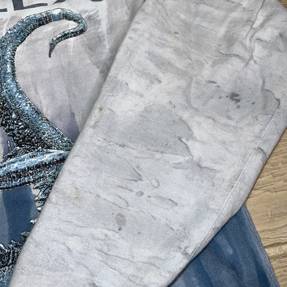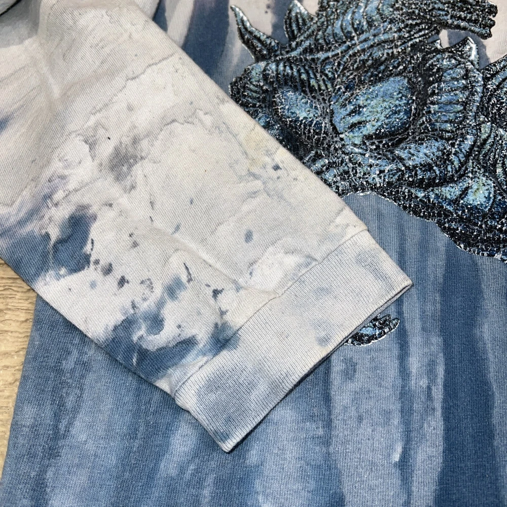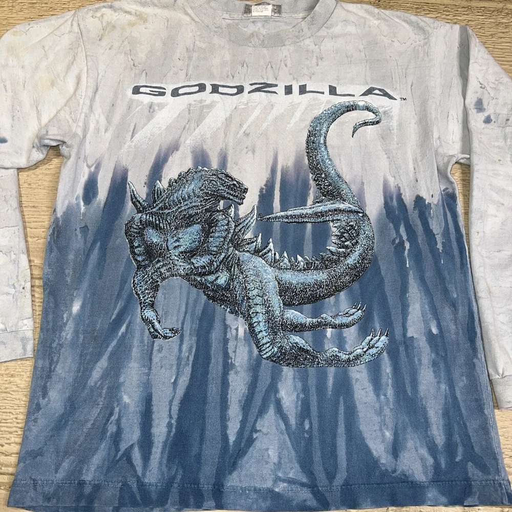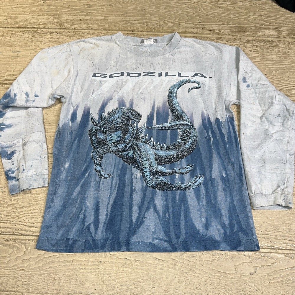 Measurements are in photos for reference. Needs a bleach bath, has yellow stains throughout the sleeves and cracking on the graphic. Up for sale is an iconic piece of vintage apparel that will make any Godzilla fan's heart soar. This shirt features a classic movie promo graphic and is made from comfortable cotton material. The crew neck and long sleeves make it a versatile choice for any season and the blue color adds a pop of fun to any outfit. The shirt is available in a Kids Large size or can fit an Adult Small, with a regular fit that is suitable for any body type. It was manufactured in Mexico during the 1990s and has a fun 90s theme. This shirt is perfect for collectors or anyone looking to add a touch of nostalgia to their wardrobe.