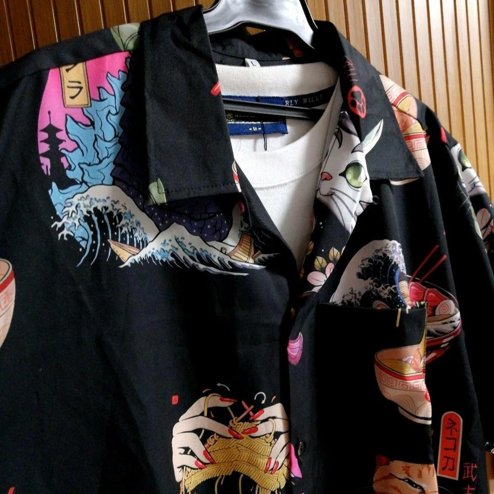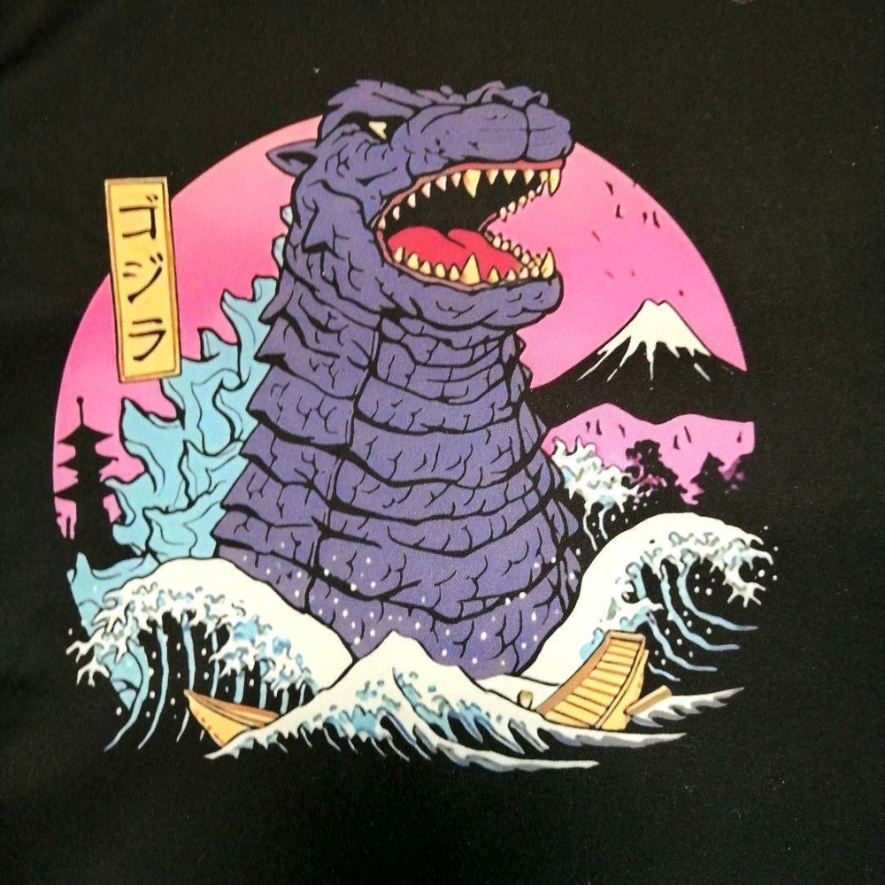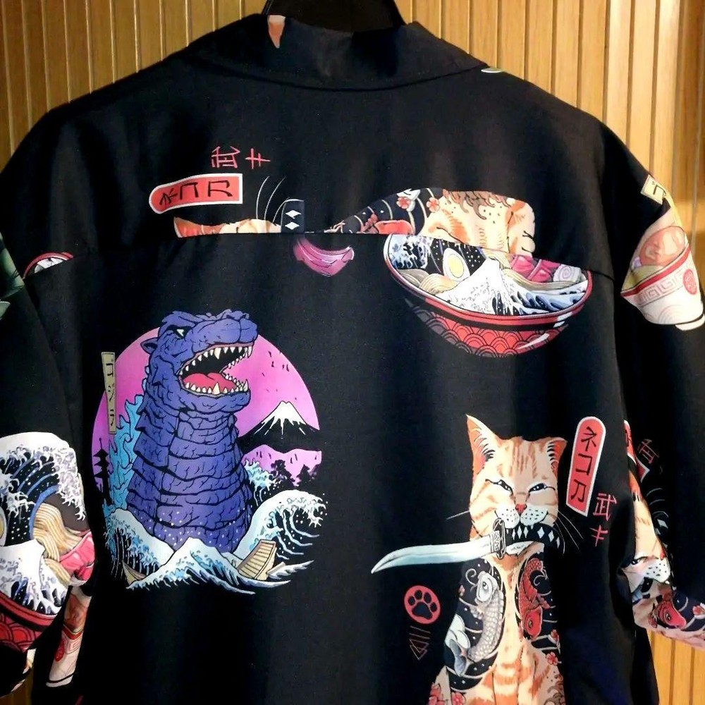 This shirt is so fun and unique! The Godzilla cat ramen design is quirky and eye-catching, and the fabric is soft and comfortable. Fits true to size, and the print quality is excellent. Super fast shipping from Japan—very happy with this purchase! Perfect for casual wear or as a fun statement piece. Highly recommend!
