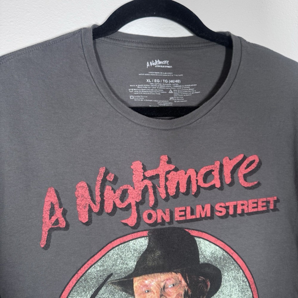 Embrace your love for classic horror with this men's XL tee from A Nightmare On Elm Street. Featured in a versatile gray hue, this short-sleeved, crew neck t-shirt is designed for comfort and style. Crafted from soft cotton material, it's a cozy choice for any season, whether you're reliving the chills of the 80s or just looking to add a touch of nostalgia to your wardrobe. The shirt boasts a bold graphic print celebrating the iconic slasher movie, making it a standout piece for fans and collectors alike. It's machine washable for easy care and fits true to size for a regular silhouette. Whether you're out on a casual day or gathering with friends, this t-shirt is an excellent way to showcase your passion for the cult classic film. Smoke free.