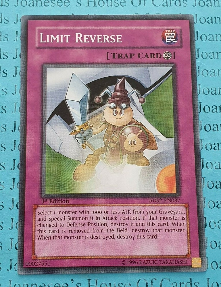 This is a Common Trap Limit Reverse Card text: Target 1 monster with 1000 or less ATK in your Graveyard; Special Summon it in Attack Position. If the target is changed to Defense Position, destroy it and this card. When this card leaves the field, destroy the target. When the target is destroyed, destroy this card. 5DS2 -EN037 1st Edition English Mint/NMint Condition Totally Original Konami (or your money back!) I will deliver in safe packaging to keep it in perfect condition. Ideal for players and collectors alike. Check out my other items! I will combine postage costs for multiple purchases. Sign up for my email newsletters by adding my eBay Shop to your favourites