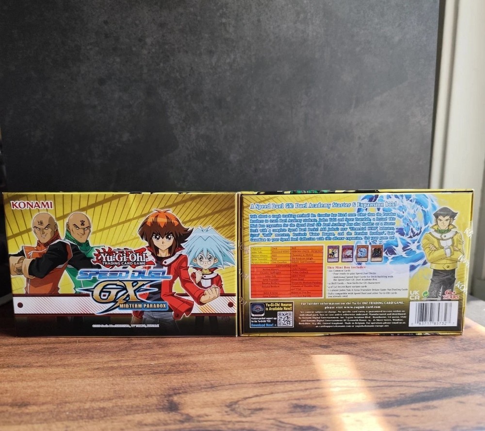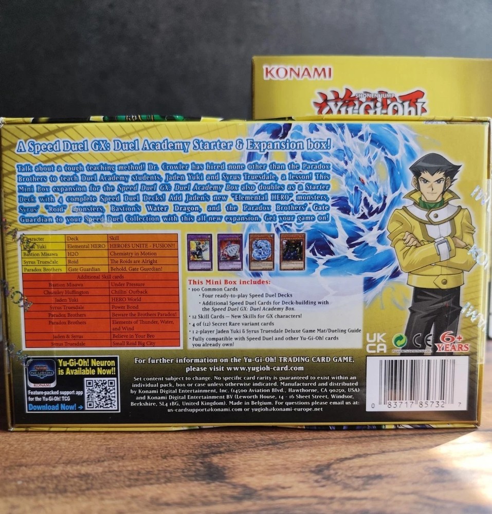 Got six of these Speed Duel GX boxes and couldn’t be happier! Each one was sealed and packed with four decks plus promos—perfect for dueling with friends. The cards are legit Konami, and the value for the lot is amazing. No issues at all, just pure Yu-Gi-Oh fun. Highly recommend for collectors or players looking to expand their decks!
