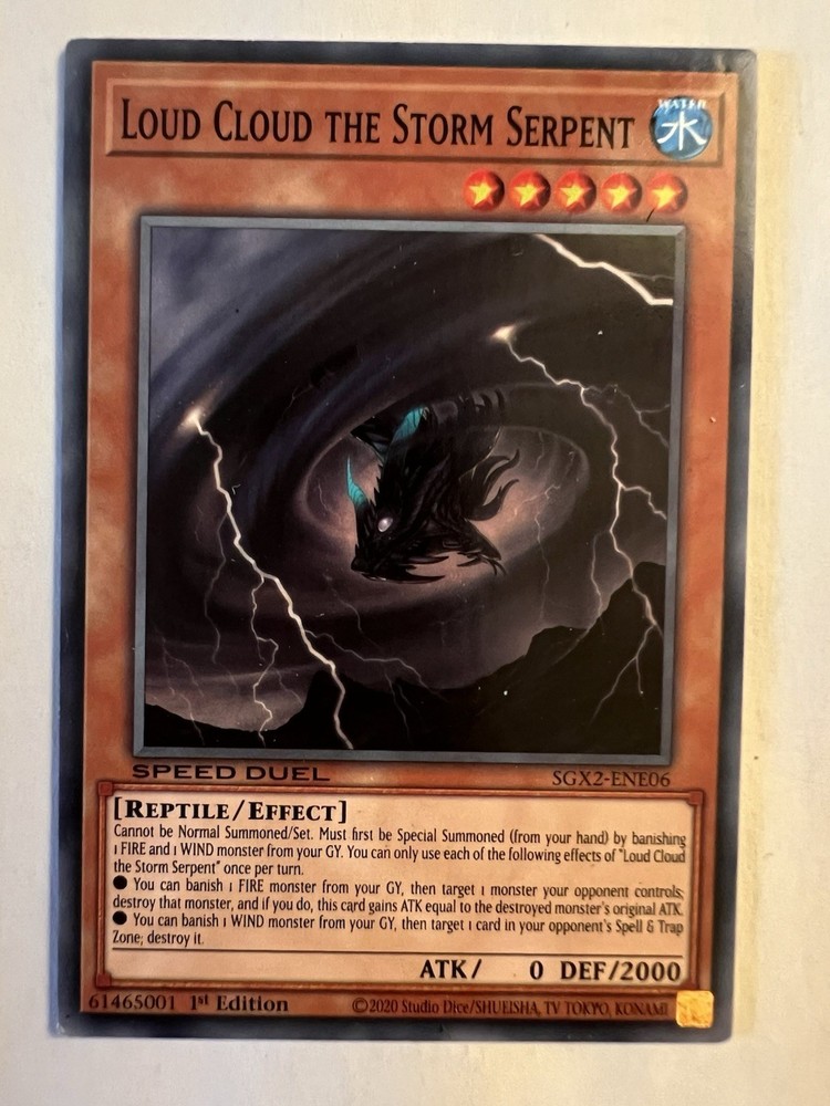 Dive into the Speed Duel action with "Loud Cloud the Storm Serpent - SGX2-ENE06," a Common card from the Speed Duel GX: Midterm Paradox set. As an Effect-type card with the Reptile creature type, this Water attribute monster can be a fierce addition to your deck, literature suggests. Manufactured by Konami in 2022, this 1st Edition card is a must-have for collectors and players alike, providing a splash of strategic depth to your game. Crafted from high-quality card stock with a Regular finish, "Loud Cloud the Storm Serpent" features English language text, ensuring ease of play for Duelists of all levels. The card comes in the Japanese card size format, seamlessly fitting into your existing collection. With its unique abilities and creature type, this card is a worthy contender in any Yu-Gi-Oh! battle.