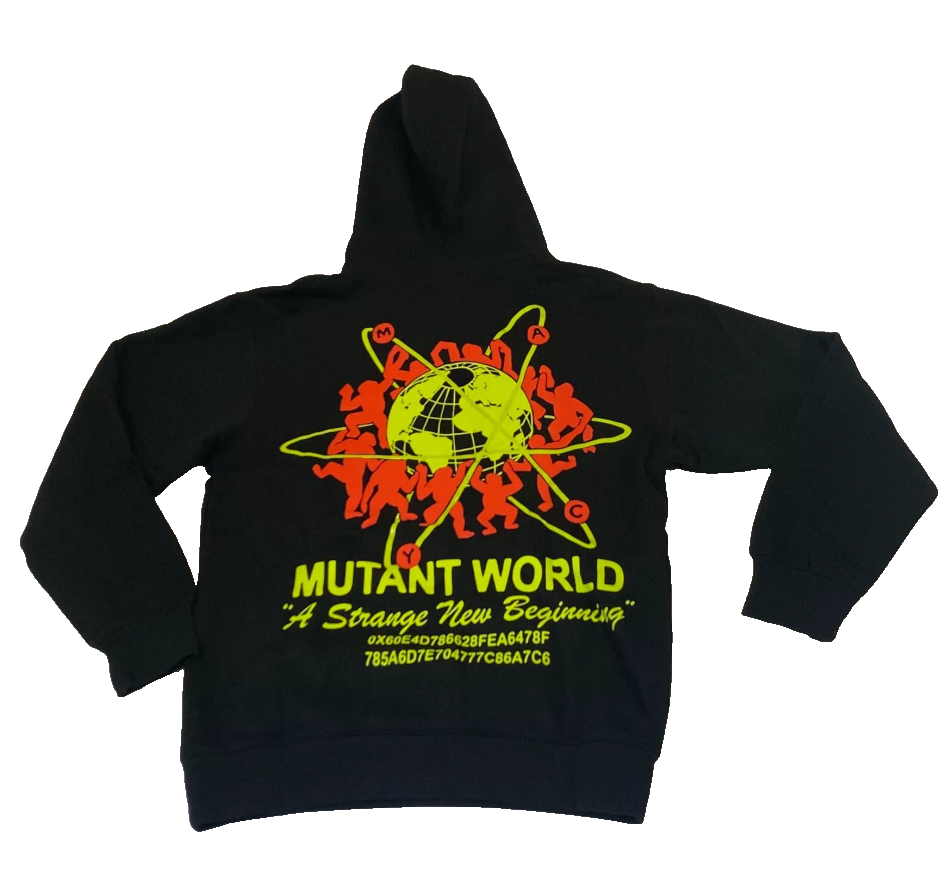 MAYC Designer Streetwear Graphic Print Hoodie, featuring the eclectic "Mutant world" design. This black, cotton jersey hoodie is tailored for an athletic fit and is perfect for all seasons with its breathable fabric and hooded feature. Whether you're out for a casual meetup or just lounging at home, this limited edition piece will add a distinctive touch to your attire. The hoodie boasts an array of pop culture references with its vibrant graphic print, including characters from Marvel Universe, Game of Thrones, and Teenage Mutant Ninja Turtles, among others. The classic crew neck and long sleeves complete the look, making it a versatile addition to any fan's collection or a bold statement for those who appreciate unique, designer streetwear.