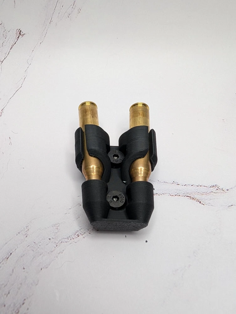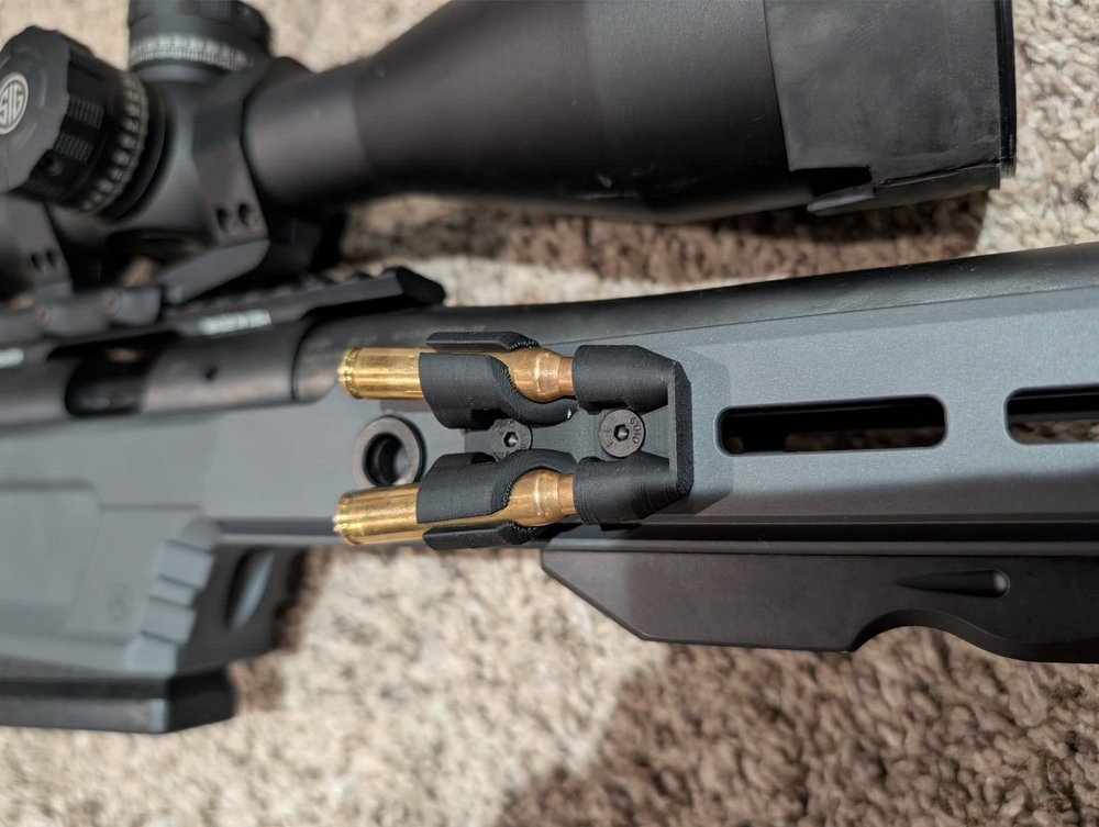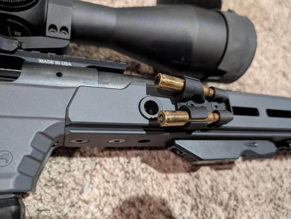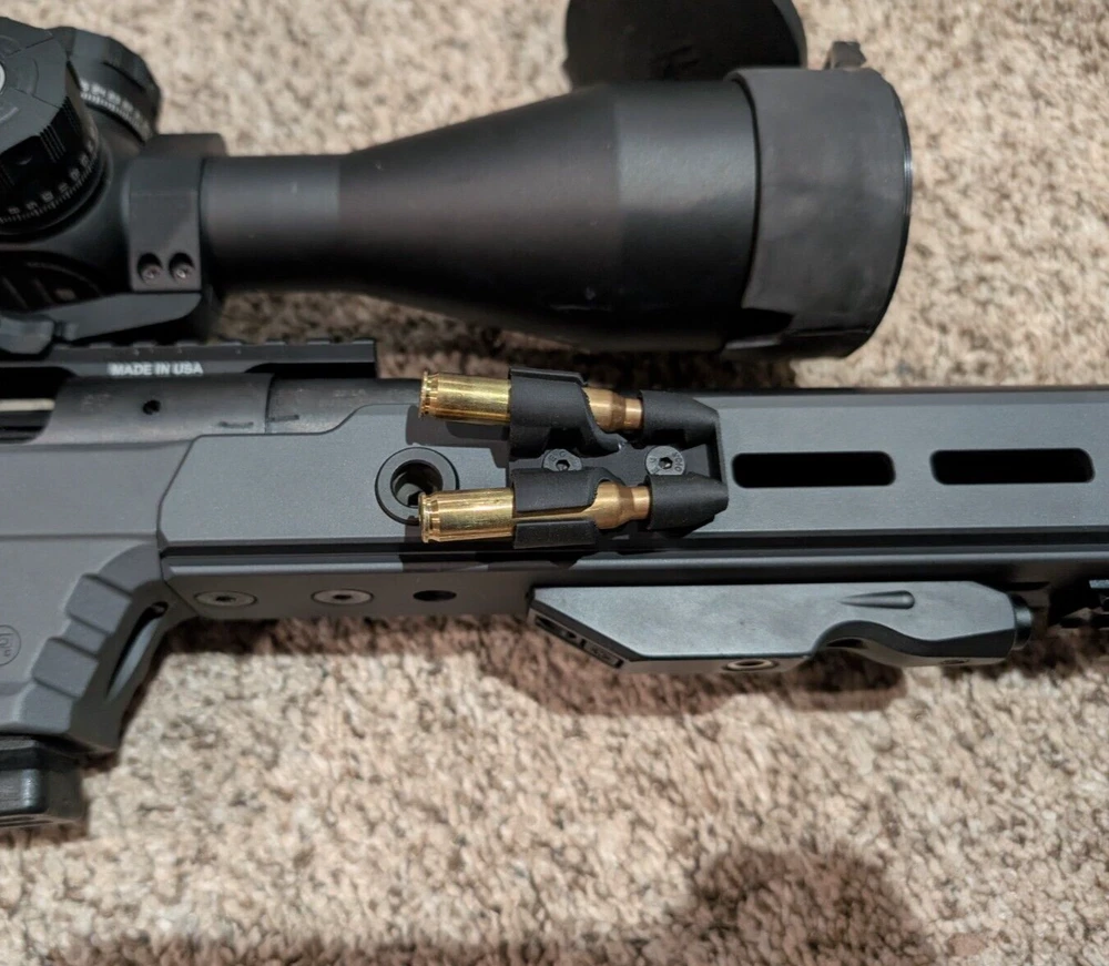 This item is made in Texas. It is not Chinese import and resale. The bullet tip is shielded from damage unlike other types. A simple, inexpensive, lightweight, and effective spare round holder. Screw holes are recessed. Easy to remove or install. It is compatible with 5.56, .223, and 300 Blackout. Uses one M-lok slot. The fitment is rather tight, so you won't have to worry about any rounds falling out. After some use it will break in. Keymod may work, but it is not yet tested. Other calibers may prove effective, however, I have yet to verify their effectiveness. Ideal for bolt action hunters. One can maintain several distinct types or grains of ammunition within reach. It is supplied with the necessary mounting hardware. It works with the MDT Woox Magpul XLR KRG Bravo, Sig Cross, and many others. Now available in two material. Polymer for general use and Polycarbonate carbon fiber for high strength and heat resistant.