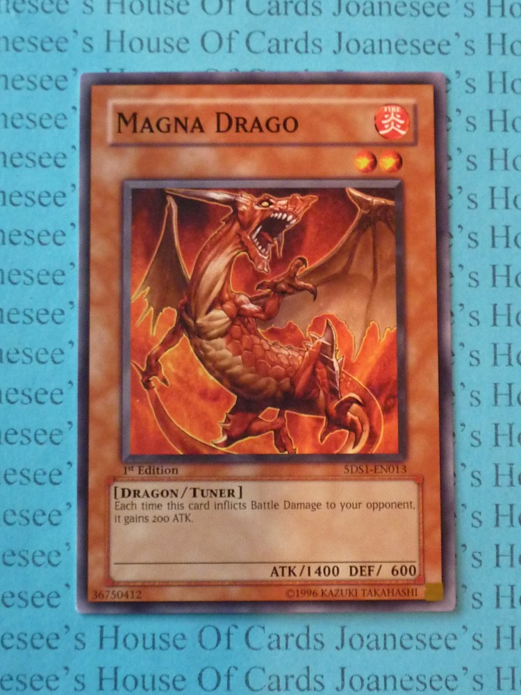 This is a Common Fire Dragon Tuner Magna Drago 2 Stars ATK/1400 DEF/600 Card text: If this card inflicts battle damage to your opponent: It gains 200 ATK. 5DS1 -EN013 1st Edition English Mint/NMint Condition Totally Original Konami (or your money back!) I will deliver in safe packaging to keep it in perfect condition. Ideal for players and collectors alike. Check out my other items! I will combine postage costs for multiple purchases. Sign up for my email newsletters by adding my eBay Shop to your favourites