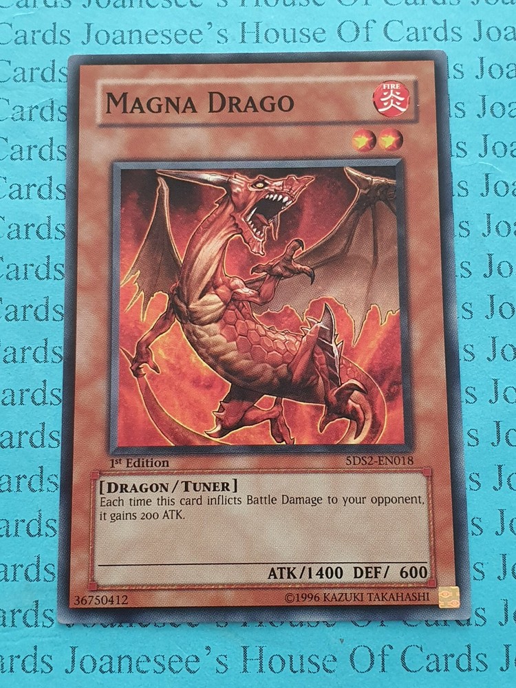 This is a Common Fire Dragon Tuner Magna Drago 2 Stars ATK/1400 DEF/600 Card text: If this card inflicts battle damage to your opponent: It gains 200 ATK. 5DS2 -EN018 1st Edition English Mint/NMint Condition Totally Original Konami (or your money back!) I will deliver in safe packaging to keep it in perfect condition. Ideal for players and collectors alike. Check out my other items! I will combine postage costs for multiple purchases. Sign up for my email newsletters by adding my eBay Shop to your favourites