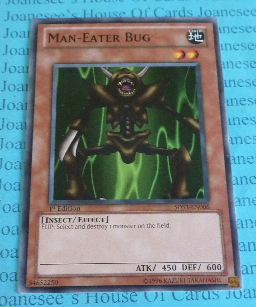 This is the Common Earth Insect Man-Eater Bug 2 Stars ATK/450 DEF/600 Card text: FLIP: Target 1 monster on the field; destroy it. 5DS3-EN006 1st Edition English Mint/NMint Condition Totally Original Konami (or your money back!) I will deliver in safe packaging to keep it in perfect condition. Ideal for players and collectors alike. Check out my other items! I will combine postage costs for multiple purchases. Sign up for my email newsletters by adding my eBay Shop to your favourites