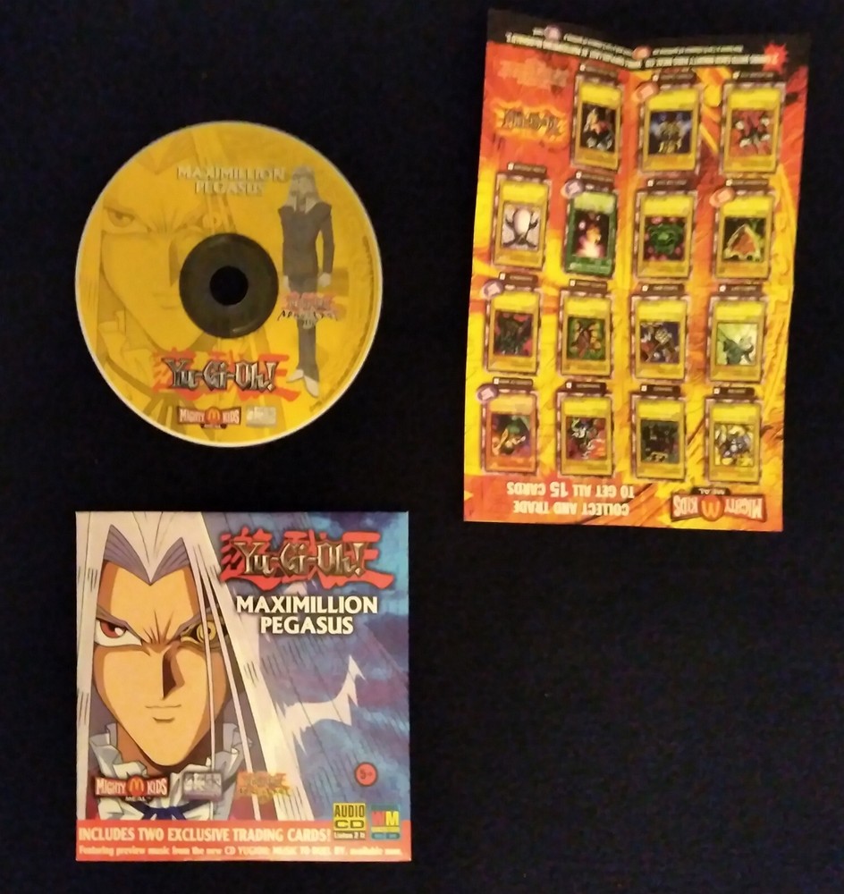 Relive your favorite Yu-Gi-Oh! moments with this rare collectible Mighty Kids Meal toy featuring Maximillion Pegasus. This limited edition CD (part of the Yu-Gi-Oh! franchise) is a must-have for any true fan. Don't miss out on the opportunity to own a piece of Yu-Gi-Oh! history. This has been opened and someone has taken the cards so it’s the CD only with the cover and original checklist.