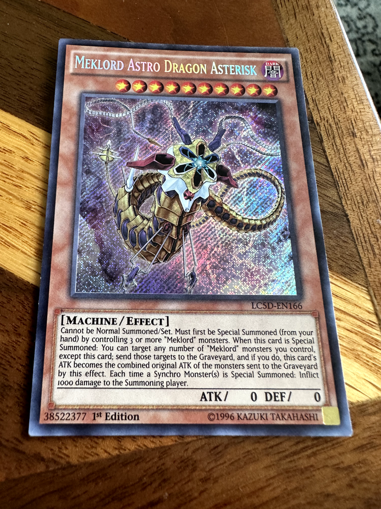 Hello! You are buying one Meklord Astro Dragon Asterisk LC5D-EN166 1st Edition Secret Rare in very lightly played condition. Reason for very lightly played condition is extremely minor general play/scratchwear, mostly on back. See photos for details! As a thank you for buying from me, I will throw in two free Yugioh commons! Thank you so much for looking, have a great day! If there is ever an issue, please let me know so I can do whatever I can to resolve it! Please check out my other items! I have many more single cards!