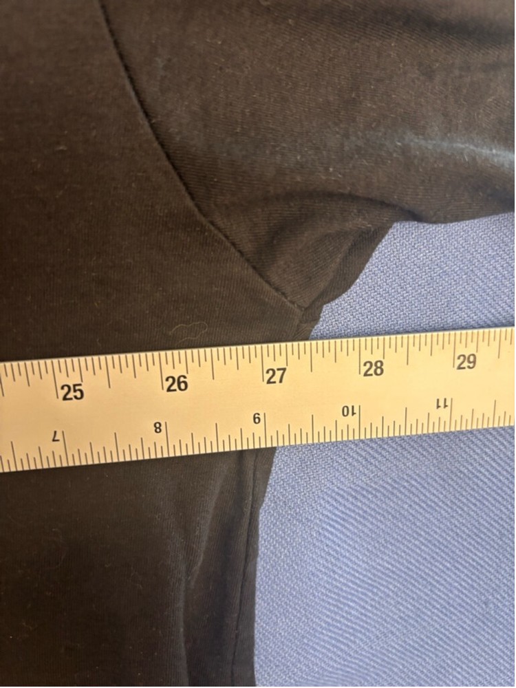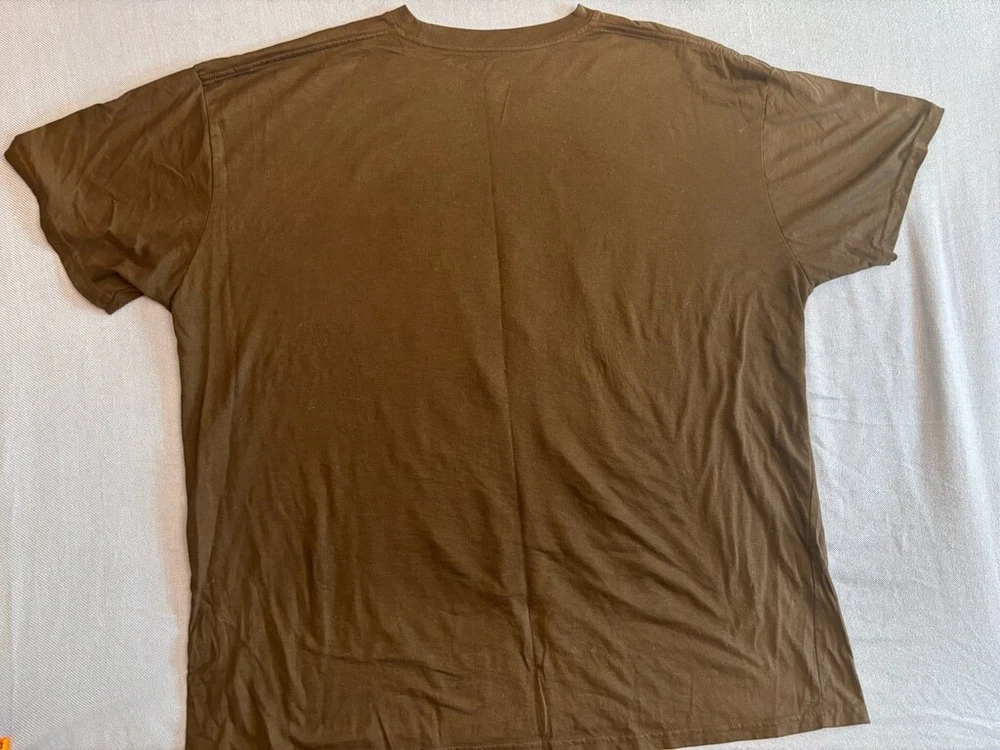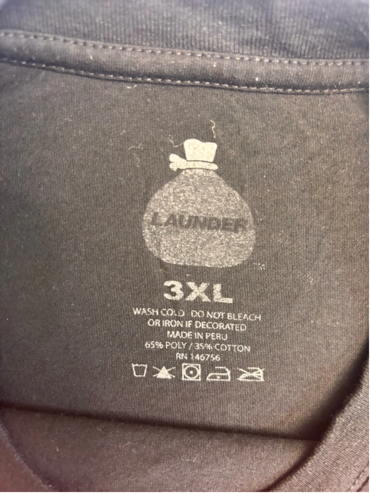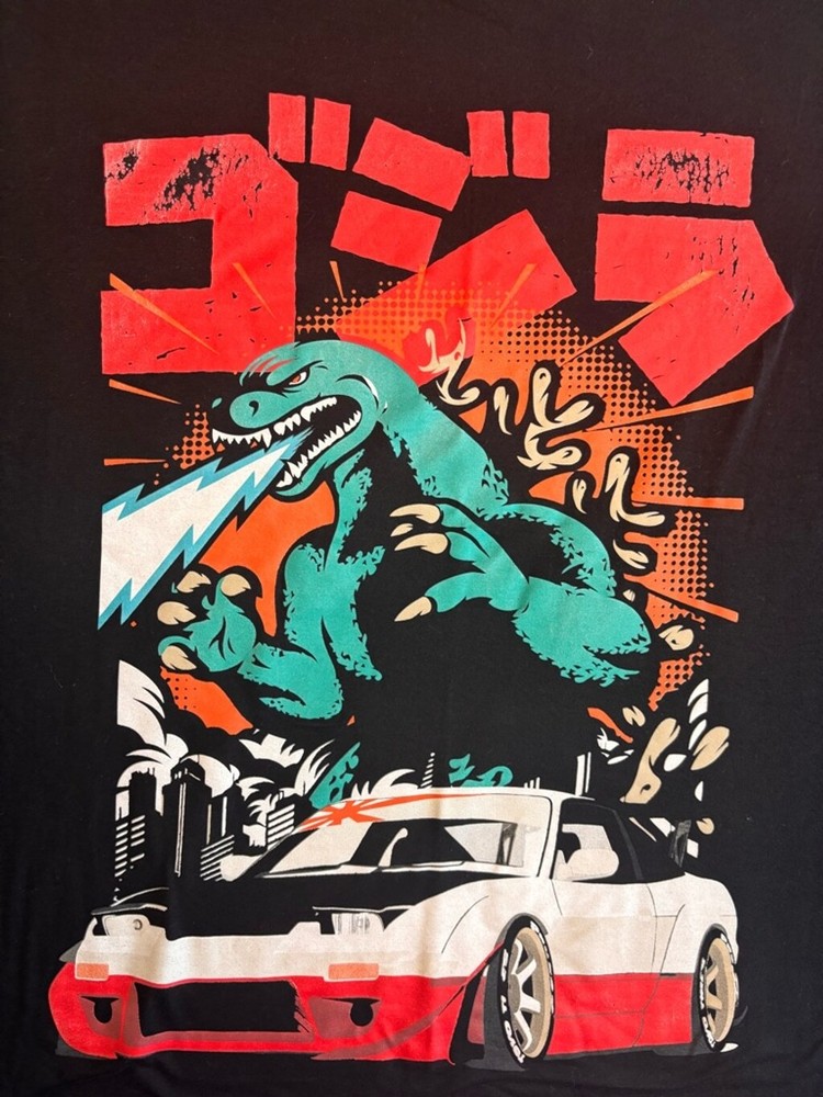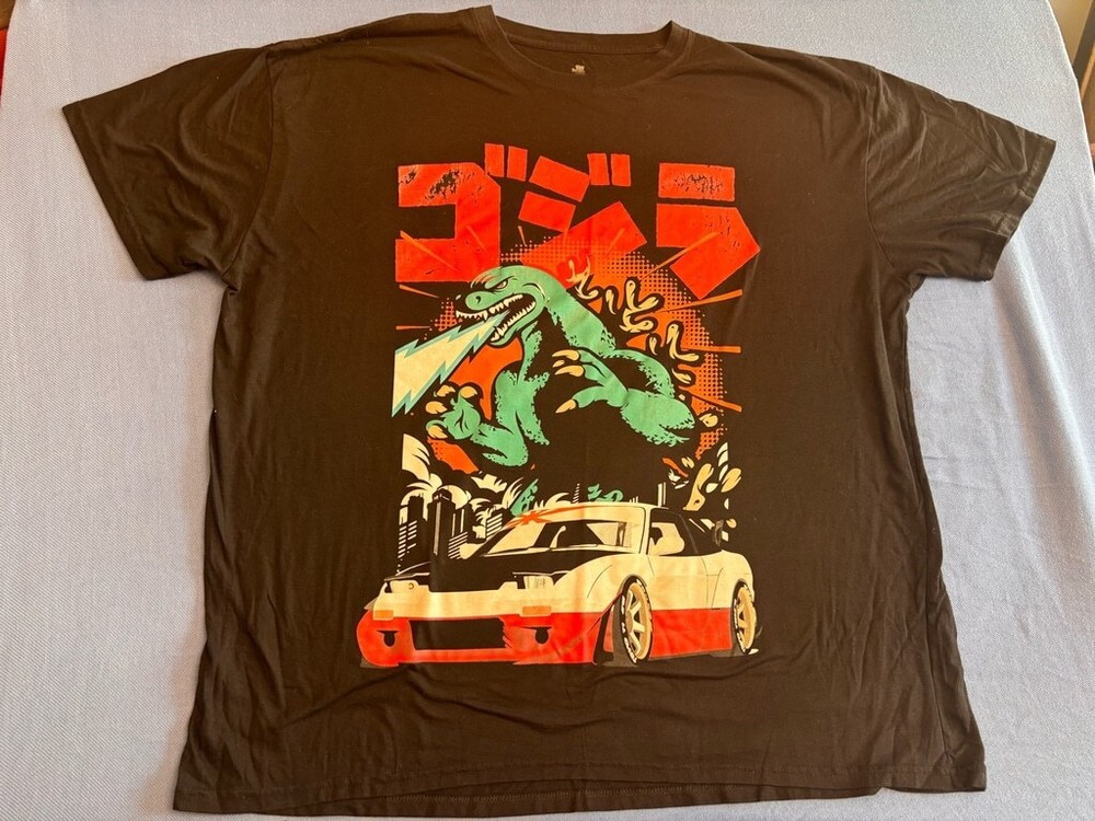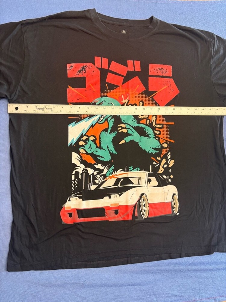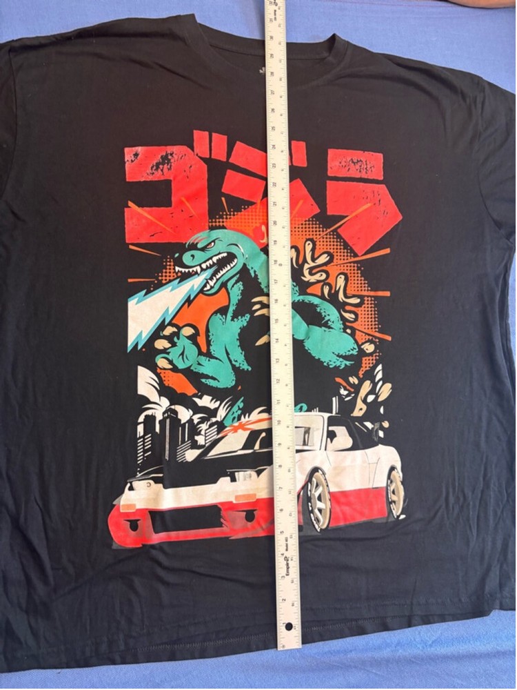 This is a pre-owned, size 3XL, black t-shirt by Launder. The shirt features a graphic print of Godzilla and a car. The material is 65% polyester and 35% cotton. The shirt measures approximately 29 inches in width and 32 inches in length. There are no visible stains or tears. The shirt is in good condition.