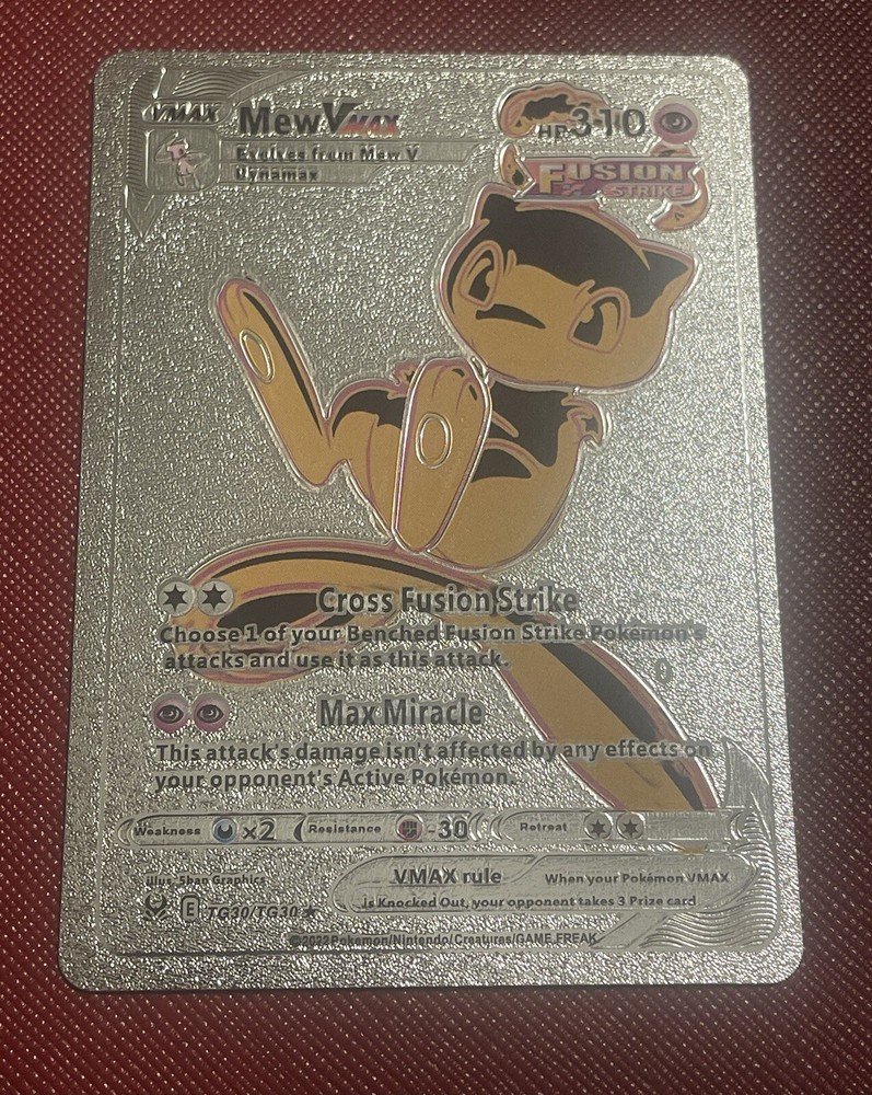 This Mew VMAX fan art card is absolutely stunning! The silver foil detailing pops beautifully, and the near-mint condition is flawless. It's surprisingly flexible yet durable, making it perfect for display or play. A must-have for any Pokémon collector!