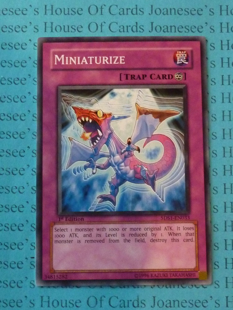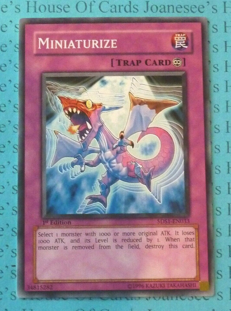 This is a Common Trap Miniaturize Card text: Activate this card by targeting 1 face-up monster on the field with more than 1000 original ATK that has a Level; its Level is reduced by 1, also it loses 1000 ATK. When that monster leaves the field, destroy this card. 5DS1 -EN033 1st Edition English Mint Condition Totally Original Konami (or your money back!) I will deliver in safe packaging to keep it in perfect condition. Ideal for players and collectors alike. Check out my other items! I will combine postage costs for multiple purchases. Sign up for my email newsletters by adding my eBay Shop to your favourites