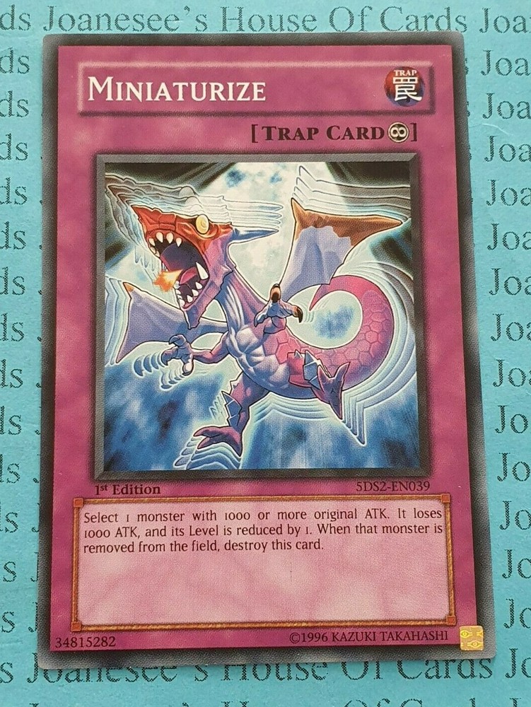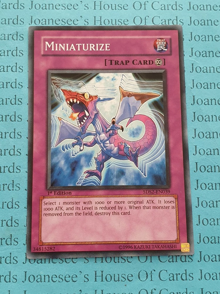 This is a Common Trap Miniaturize Card text: Activate this card by targeting 1 face-up monster on the field with more than 1000 original ATK that has a Level; its Level is reduced by 1, also it loses 1000 ATK. When that monster leaves the field, destroy this card. 5DS2 -EN039 1st Edition English Mint/NMint Condition Totally Original Konami (or your money back!) I will deliver in safe packaging to keep it in perfect condition. Ideal for players and collectors alike. Check out my other items! I will combine postage costs for multiple purchases. Sign up for my email newsletters by adding my eBay Shop to your favourites