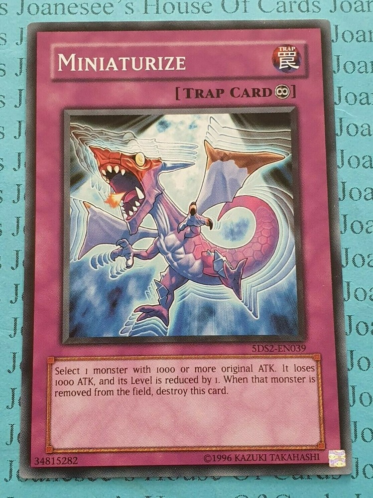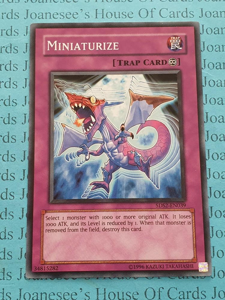 This is a Common Trap Miniaturize Card text: Activate this card by targeting 1 face-up monster on the field with more than 1000 original ATK that has a Level; its Level is reduced by 1, also it loses 1000 ATK. When that monster leaves the field, destroy this card. 5DS2 -EN039 Unlimited Edition English Mint/NMint Condition Totally Original Konami (or your money back!) I will deliver in safe packaging to keep it in perfect condition. Ideal for players and collectors alike. Check out my other items! I will combine postage costs for multiple purchases. Sign up for my email newsletters by adding my eBay Shop to your favourites