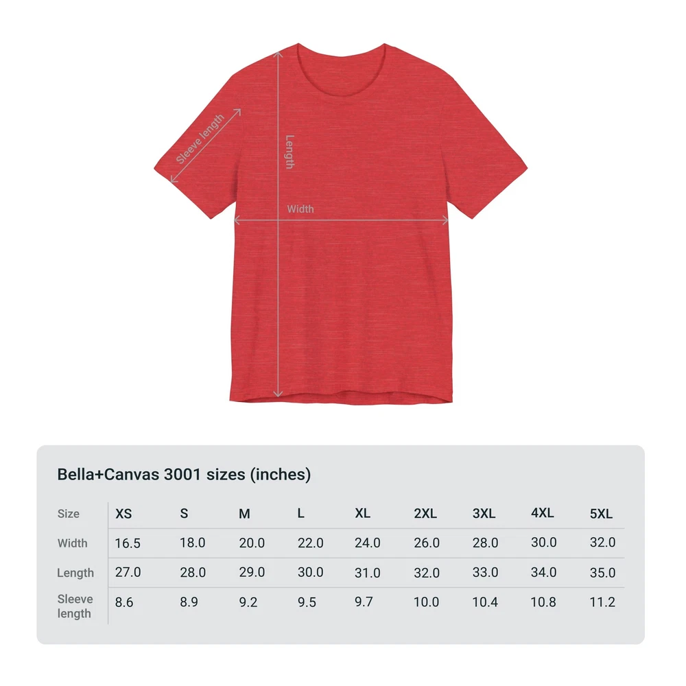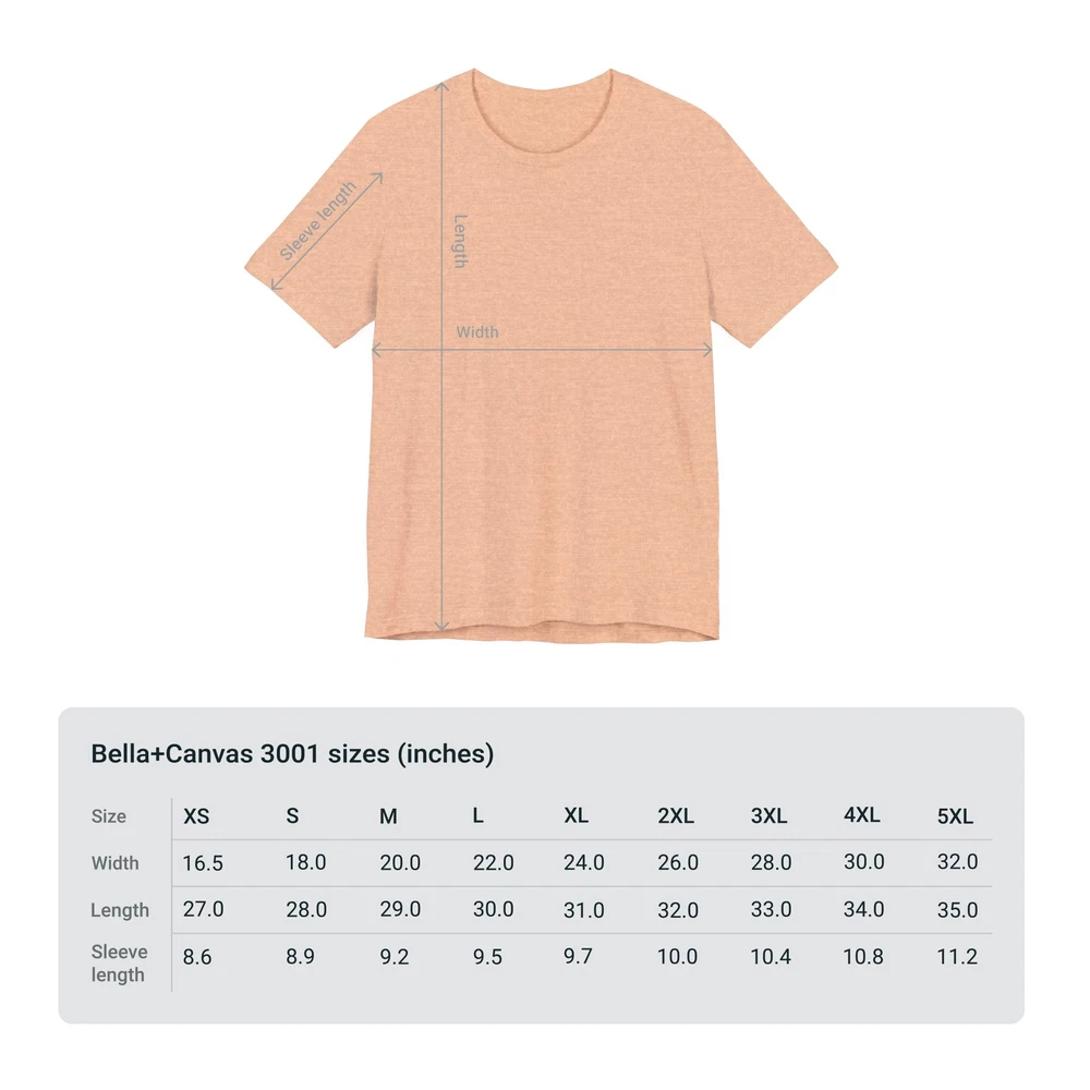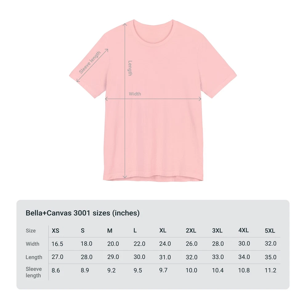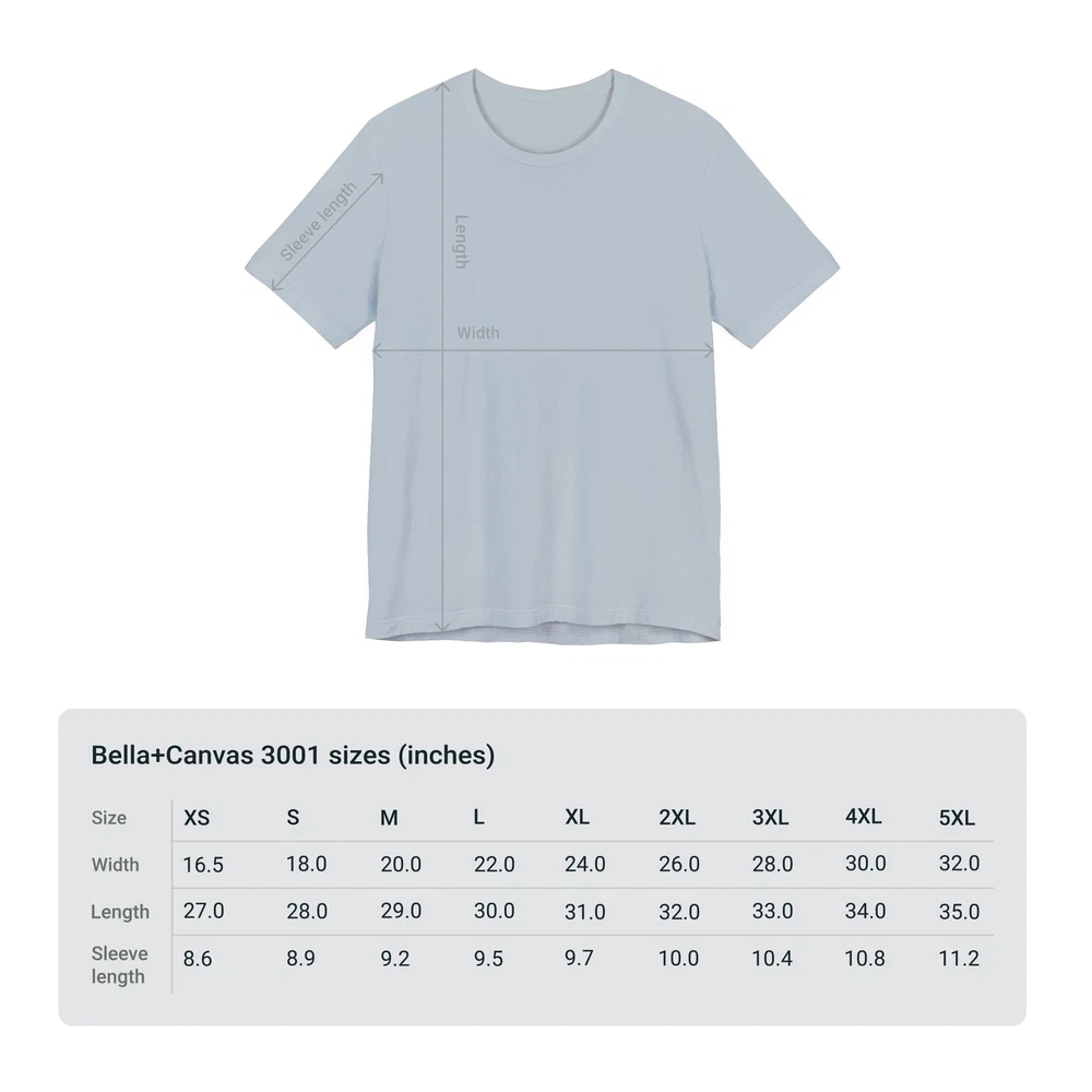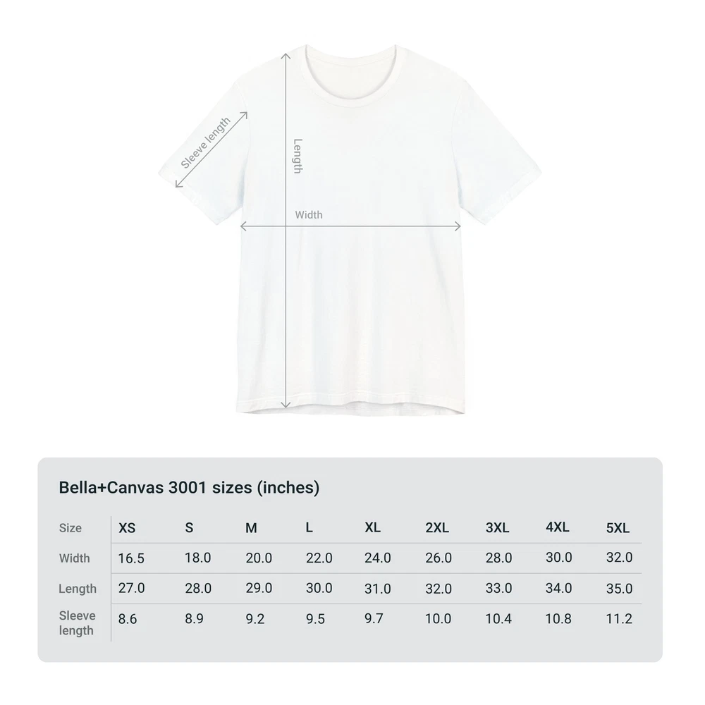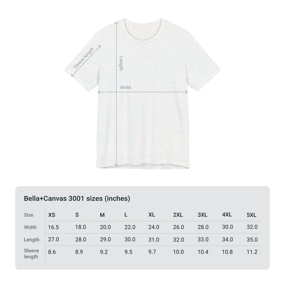 This classic unisex jersey short sleeve tee fits like a well-loved favorite. Soft cotton and quality print make users fall in love with it over and over again. These t-shirts have-ribbed knit collars to bolster shaping. The shoulders are tapered for a better fit over time. Dual side seams hold the garment's shape for longer. .: Made with 100% Airlume combed and ring-spun cotton, a lightweight fabric (4.2 oz/yd² (142 g/m²)) that is easy to layer, breathable. Perfect for active and leisure wear. .: The retail fit that is perfect for casual and semi-formal settings. The crew neckline adds a classic, neat style that's perfect for accessorizing. .: Bella+Canvas manufactures all its products in the US and internationally in humane, no-sweat-shop, sustainable way and is part of the Fair Labor Association as well as Platinum WRAP certified. .: The tear-away label minimizes skin irritations. .: Fabric blends: Ash and Heather Prism colors - 99% Airlume combed and ring-spun cotton, 1% polyester; Heather colors - 52% cotton, 48% polyester; Athletic Heather and Black Heather - 90% cotton, 10% polyester.