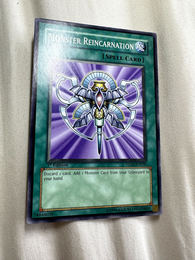 Hello! You are buying one Monster Reincarnation 5DS1-EN026 1st Edition Common in lightly played condition. Reason for lightly played condition is minor general play/scratchwear, mostly on back. See photos for details! As a thank you for buying from me, I will throw in two free Yugioh commons! Thank you so much for looking, have a great day! If there is ever an issue, please let me know so I can do whatever I can to resolve it! Please check out my other items! I have many more single cards!