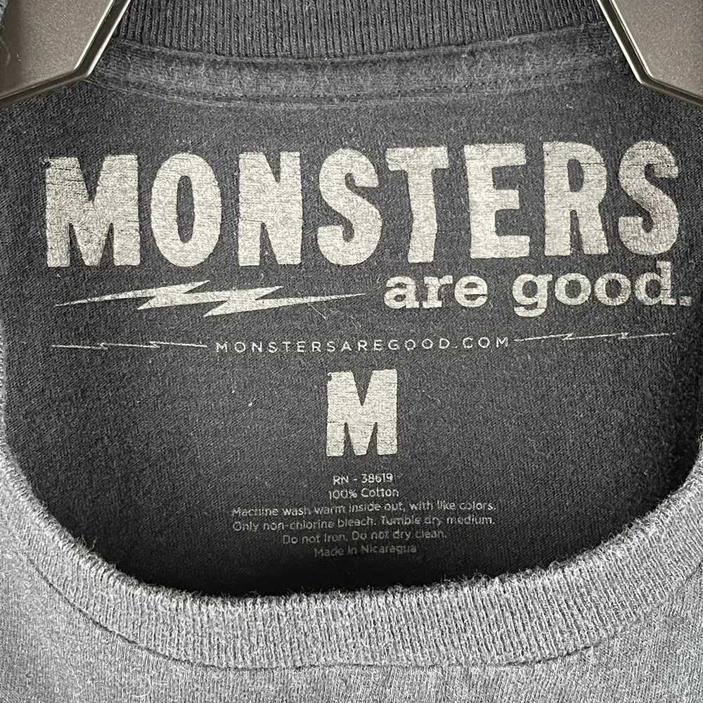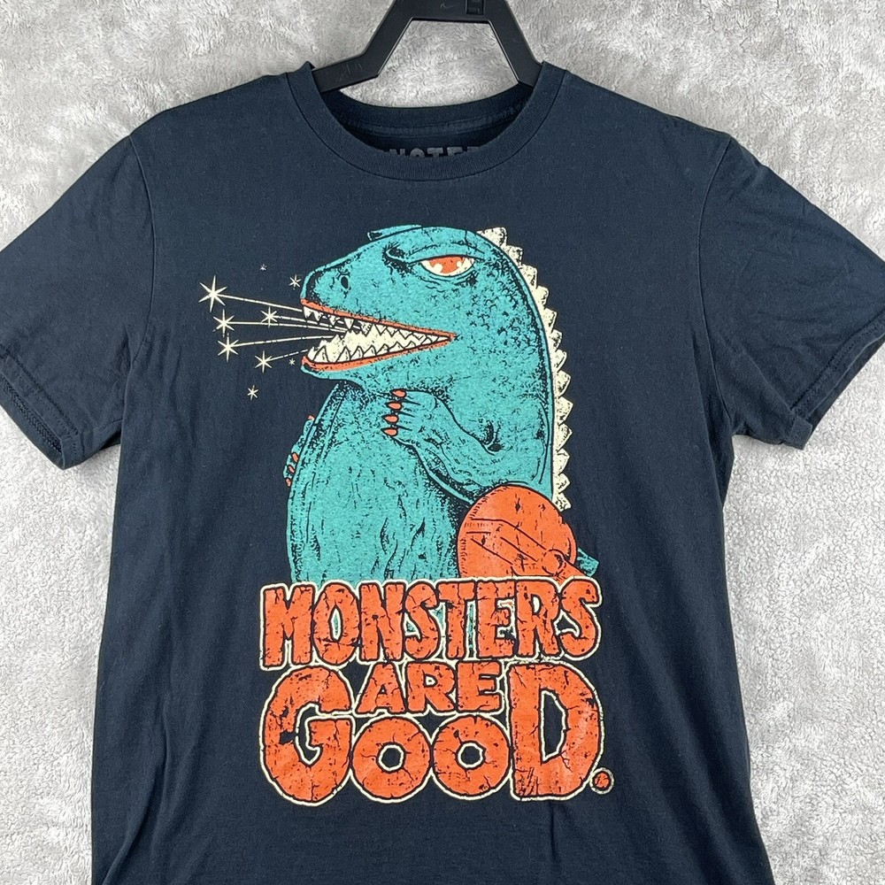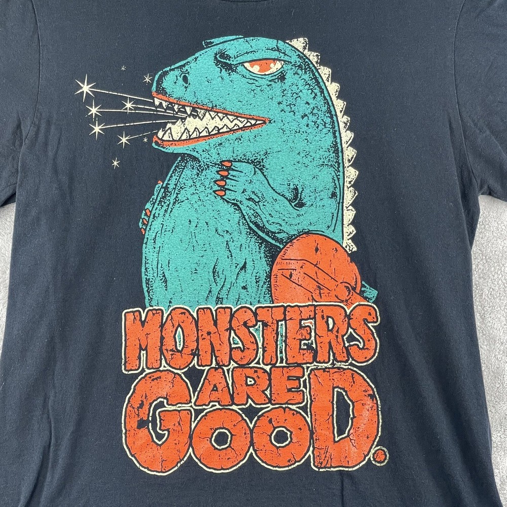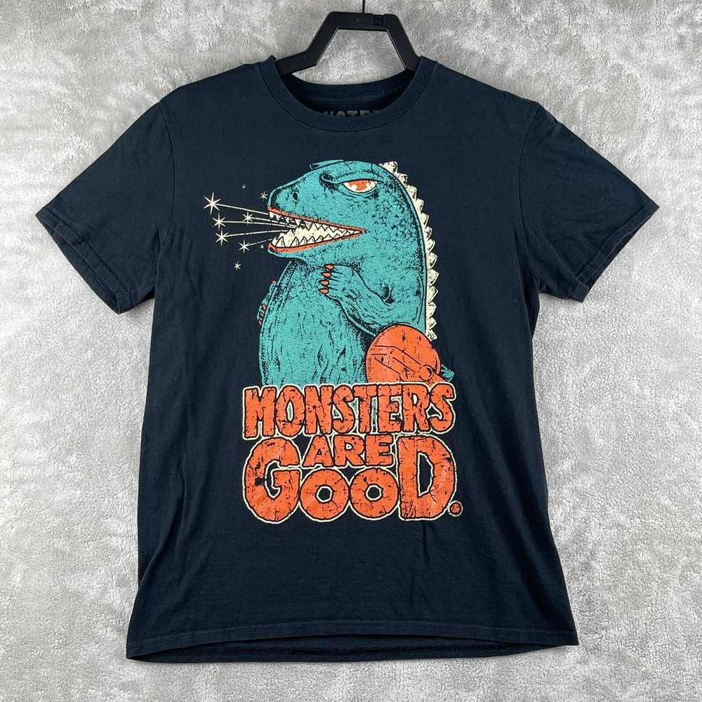 The "Monsters Are Good Godzilla Logo Tee Shirt" in black is a unisex t-shirt made of cotton jersey fabric with a crew neck and short sleeves. It features the Godzilla logo as an accent, with a tagless design for added comfort. This size medium shirt from the Monsters Are Good brand is suitable for year-round wear and is machine washable for easy care.