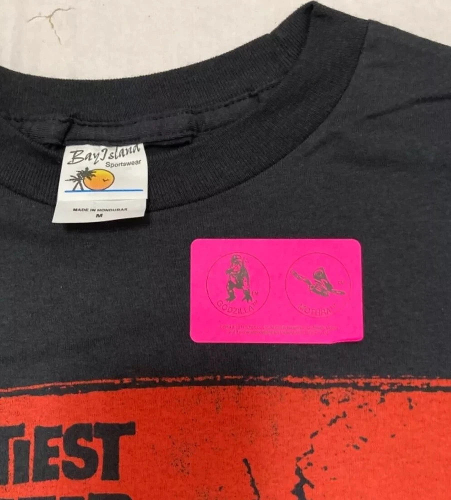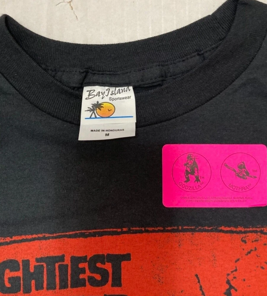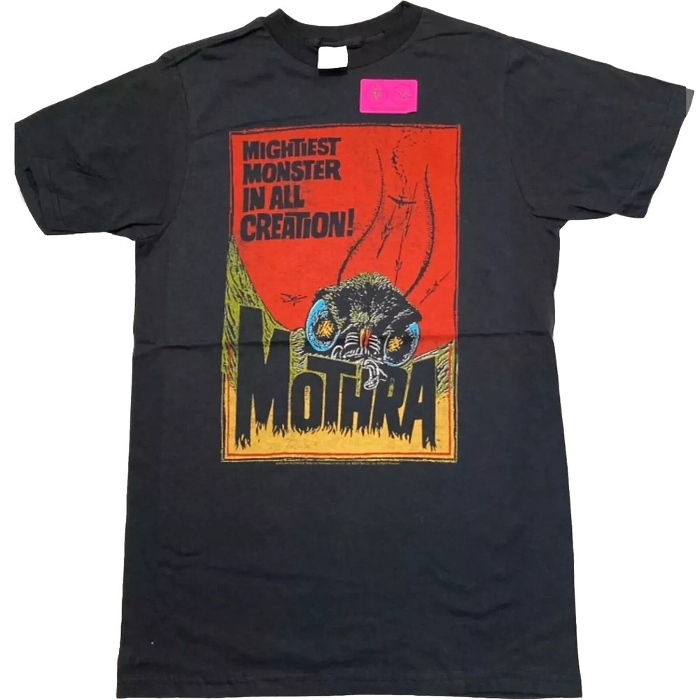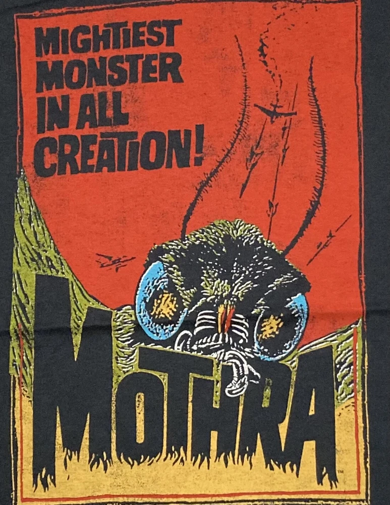 Mothra t-shirt made by Impact Merchandising, licensed by Toho. a classic Mothra poster image printed on a Bay Island sportswear cotton t-shirt. Brand new condition with the original Toho Godzilla/Mothra sticker. Size medium, from left to right under the arms, is about 18', down the front is about 27', down the back is about 28 1/4'. Size large, from left to right under the arms, is about 19 3/4", down the front is about 27", down the back is about 29 1/4". This is the original Impact/Toho shirt and not a modern reproduction.