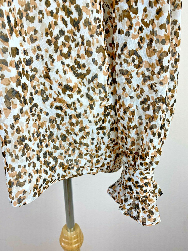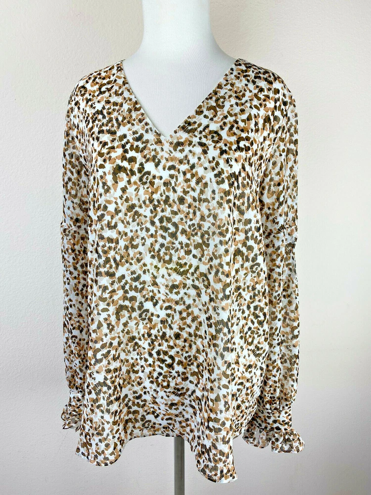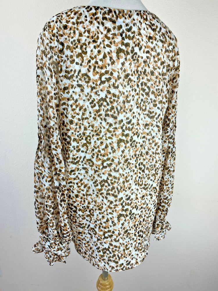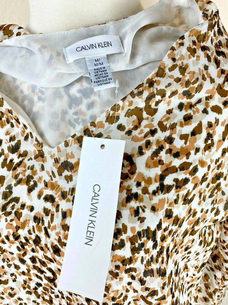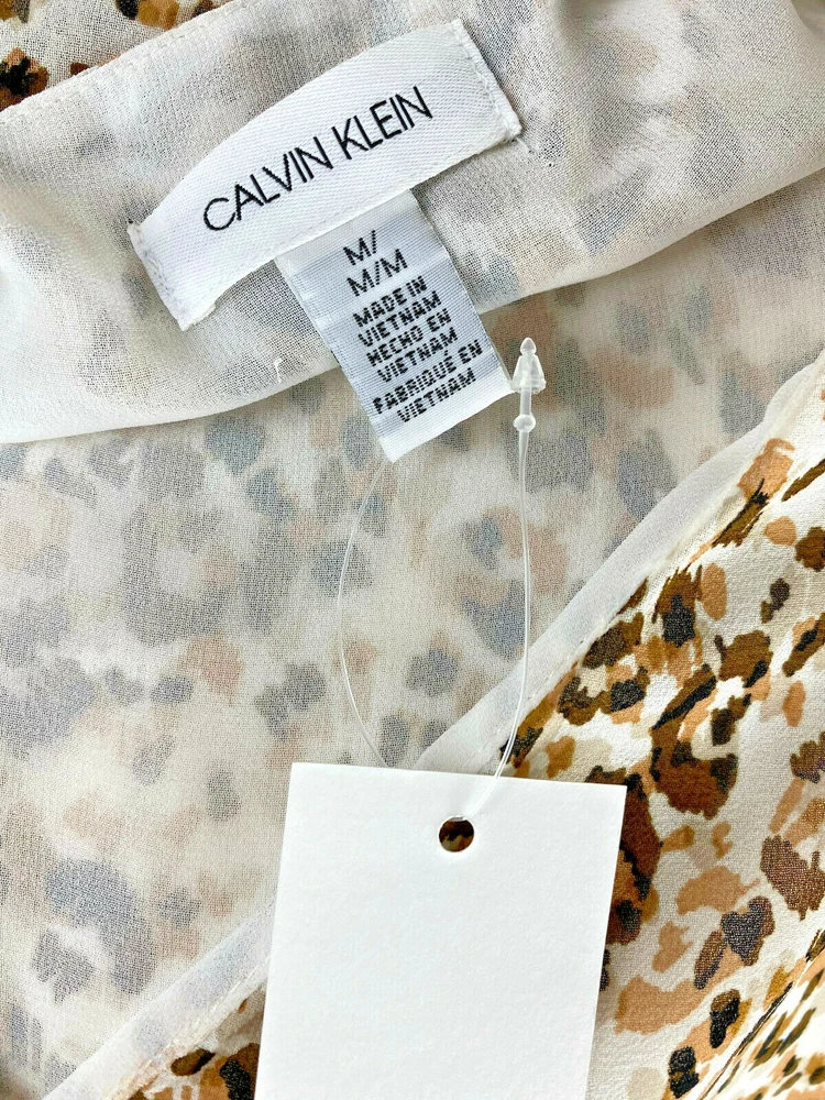 Calvin Klein Animal Print Blouse M Ruffle Long Sleeve M9HAZ543 Leopard Sheer NWT Size: Medium Style #: M9HAZ543 long sleeves with 1 button cuff closer. Lined blouse with white sheer fabric, v-neck Classic fit tunic style blouse Leopard print / animal print. Measurement: Shoulder to shoulder: 16" Sleeve length: 25" (with ruffle) Armpit to armpit: 21" Width at bottom of shirt: 22.5" Length: 26.5"