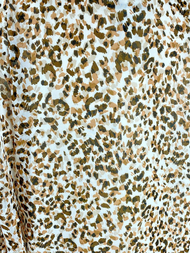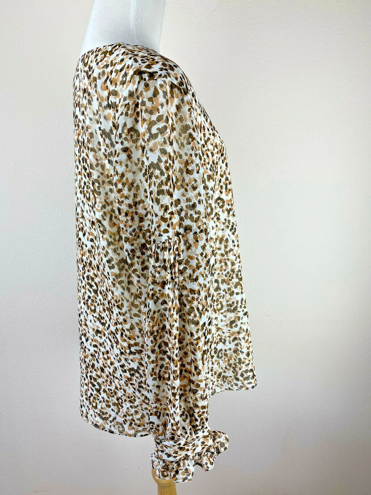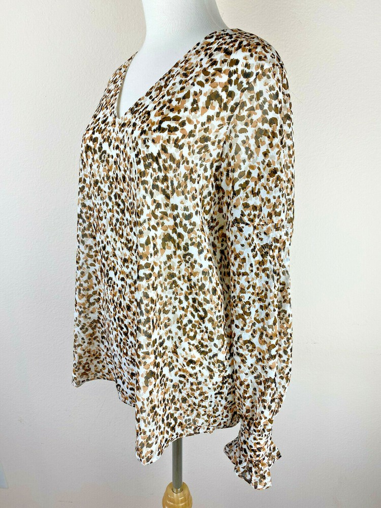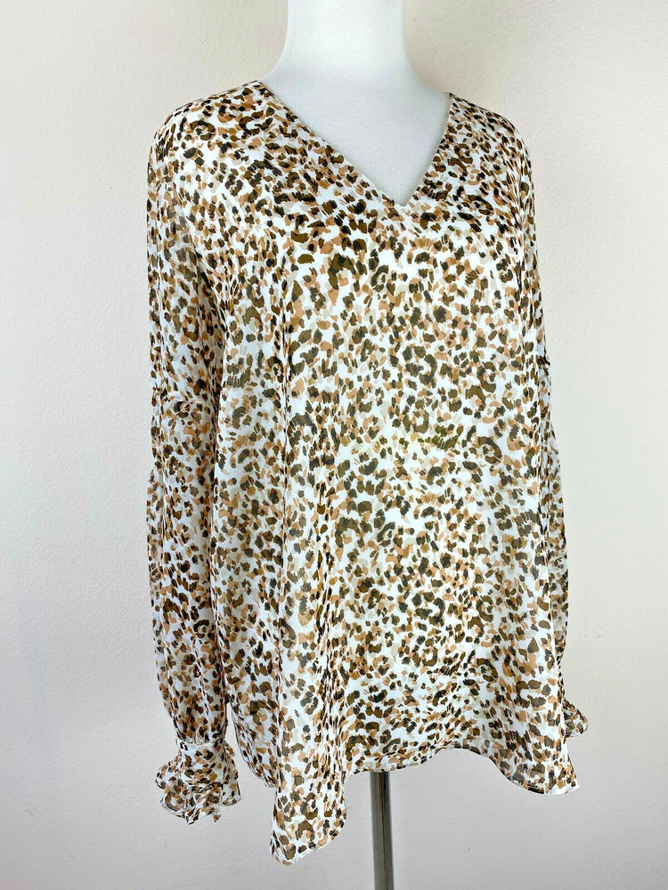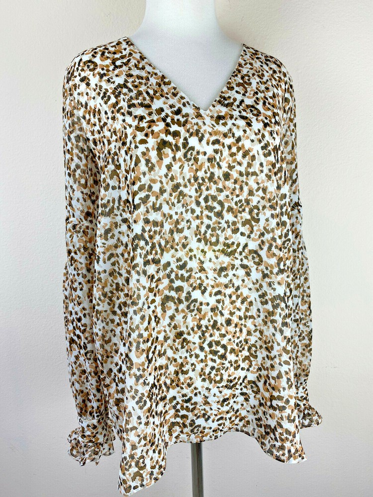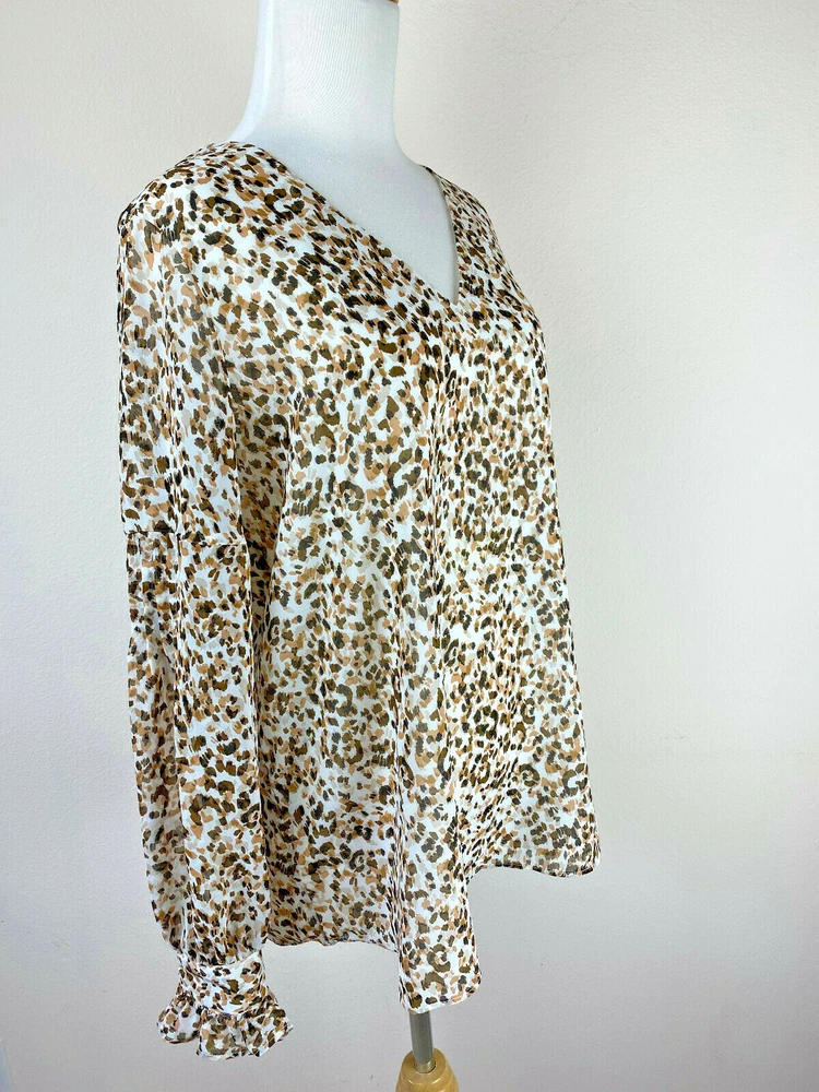Calvin Klein Animal Print Blouse M Ruffle Long Sleeve M9HAZ543 Leopard Sheer NWT Size: Medium Style #: M9HAZ543 long sleeves with 1 button cuff closer. Lined blouse with white sheer fabric, v-neck Classic fit tunic style blouse Leopard print / animal print. Measurement: Shoulder to shoulder: 16" Sleeve length: 25" (with ruffle) Armpit to armpit: 21" Width at bottom of shirt: 22.5" Length: 26.5"