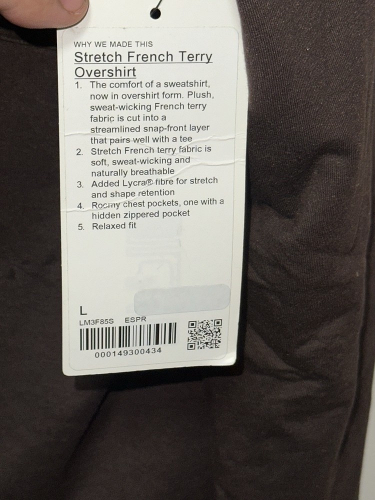 Stretch French Terry Overshirt 1. The comfort of a sweatshirt, now in overshirt form. Plush, sweat-wicking French terry fabric is cut into a streamlined snap-front layer that pairs well with a tee 2. Stretch French terry fabric is soft, sweat-wicking and naturally breathable 3. Added Lycraß fibre for stretch and shape retention 4. Rocmy chest pockets, one with a hidden zippered pocket 5. Relaxed fit