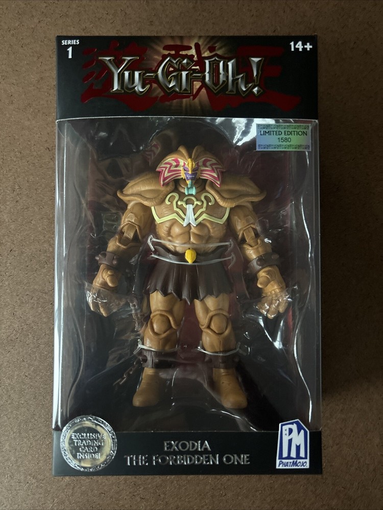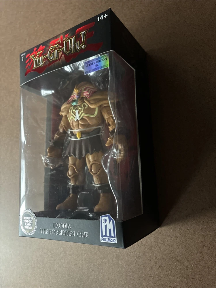 Small tear on the bottom as in photos. Some shelf life wear . Please use photos for reference. This limited edition PhatMojo Series 1 action figure features the iconic Yu-Gi-Oh! character, Exodia The Forbidden One. The figure is made of high-quality plastic and comes with an exclusive trading card. It is perfect for fans of the anime and manga franchise, and collectors of limited edition items. The action figure is designed with attention to detail, capturing the essence of the character. It is suitable for ages 14 and above and is an original, licensed reproduction. The figure is made in China and is part of the Yu-Gi-Oh! series. Get your hands on this highly sought-after item before it's too late!
