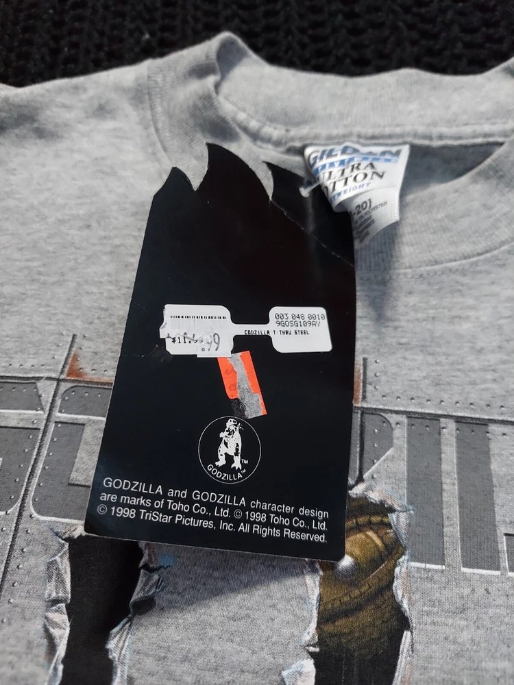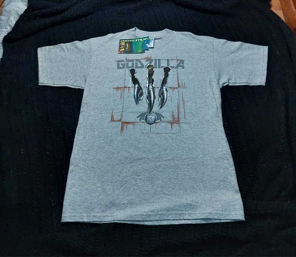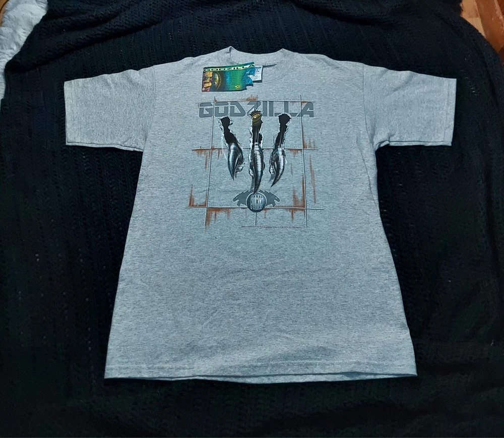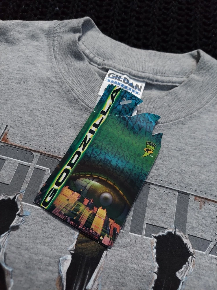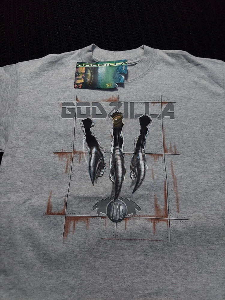 Vintage 1998 Godzilla Movie Promotion Graphic Tee Shirt Very cool shirt to promote the Godzilla franchise in the 90s. Brand new with OG tags. This is tagged a kids XL. However, this can very easily fit an Adult Small. This is shown by the chest and length measurements that are included in the photos.