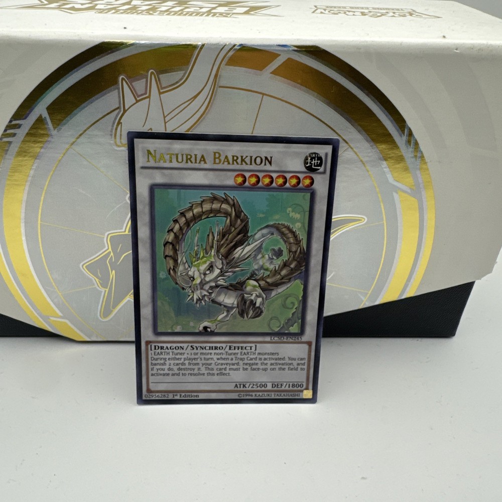 The Naturia Barkion LC5D-EN245 card is an ultra rare Dragon-type monster card from the Legendary Collection 5D's set in the Yu-Gi-Oh! TCG. Manufactured by Konami, this 1st Edition card has a defense of 1800 and an attack power of 2500, making it a powerful addition to any deck. With its Earth attribute and Synchro/Effect card type, this English language card is sure to be a valuable and sought-after collectible for fans and players alike.