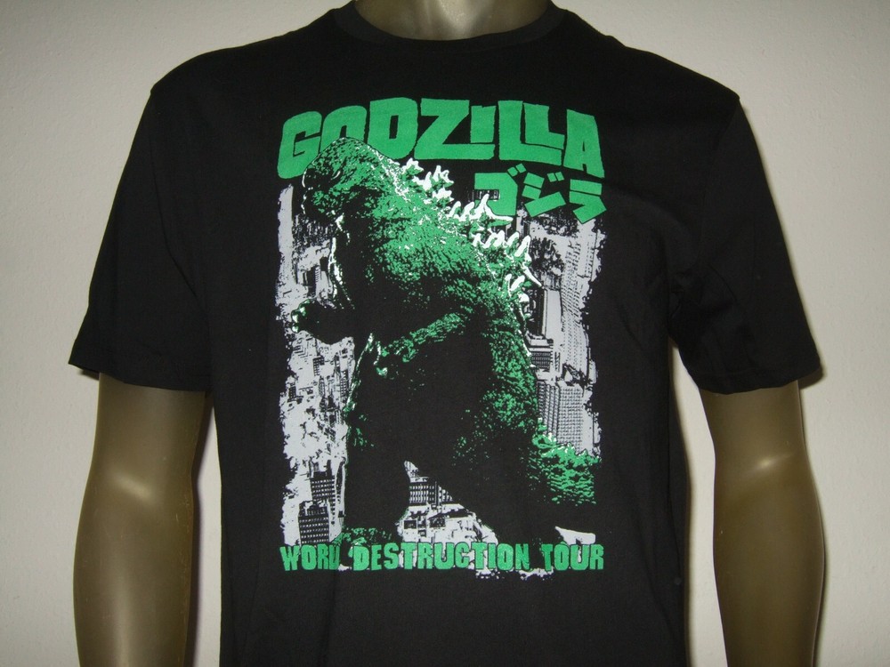 Black T-shirt with a Godzilla design on front. Nothing on the back. This listing is for one (1) tee shirt in the size you choose. Size Guide Each tee shirt has been measured by lying a flat surface. Please check measurements before purchase. Measurements for size Medium: Length from the top of the shoulder to the bottom of the shirt 28.5 inches. From across the chest is 18.5 inches. Measurements for size XL: Length from the top of the shoulder to the bottom of the shirt 29.5 inches. From across the chest is 21 inches. Measurements provided are for original listing; some sizes may be sold out. Check drop-down menu above for availability of sizes and quantities.