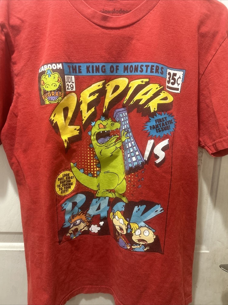 This Nickelodeon Reptar Rugrats King Of Monsters Red Cotton T Shirt in size M is perfect for any fan of the show. The shirt features a solid pattern with short sleeves and a crew neckline. It is made of comfortable and durable cotton material that is machine washable. The shirt has a retro theme and features the beloved characters Godzilla, Rex, and Tommy. It also has a graphic print of the Reptar Rugrats logo. This t-shirt is great for any season and is sure to become a favorite in your wardrobe.