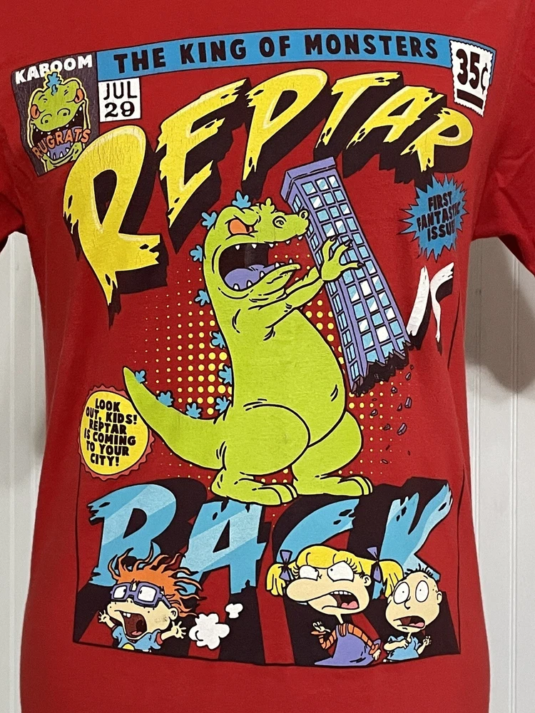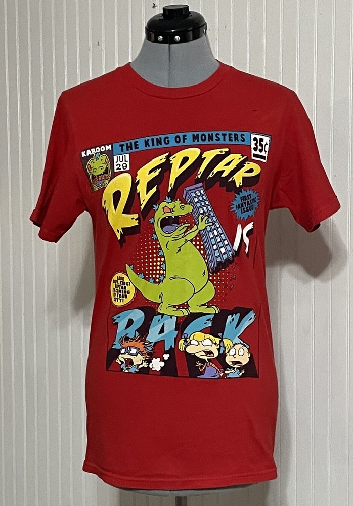 Get ready to unleash your inner child with this Nickelodeon Rugrats Reptar Dinosaur as Godzilla T-Shirt. This short sleeve, crew neck tee features the iconic Reptar character from the popular '90s cartoon, Rugrats. Made from 100% cotton, this machine washable shirt is both comfortable and durable. The solid red color and graphic print make it a great addition to any casual wardrobe. This regular fit, basic tee comes in size small and is perfect for any fan of the Rugrats cartoon. Don't miss out on the chance to show off your love for this classic animated series. Made in Bangladesh, this shirt is a must-have for any cartoon-themed outfit.