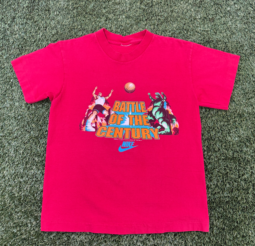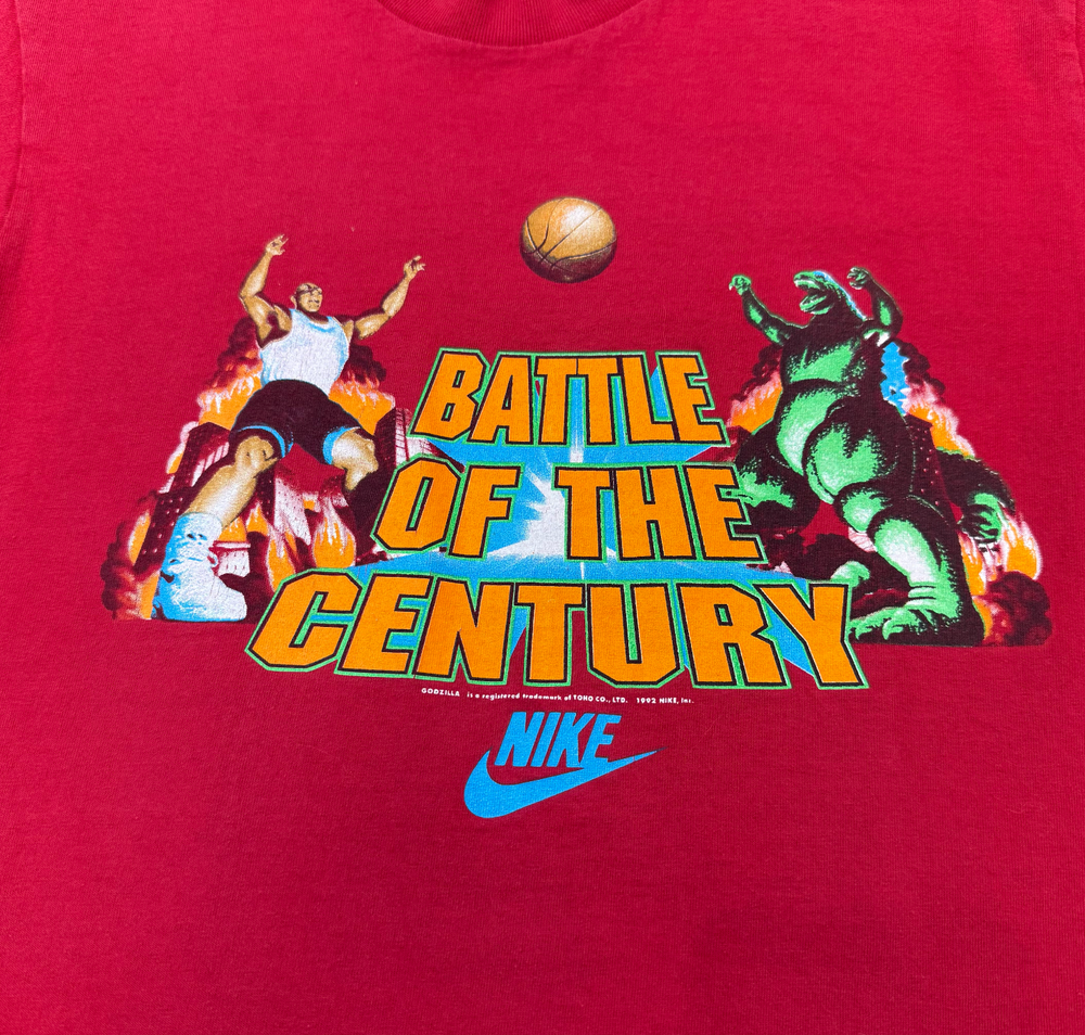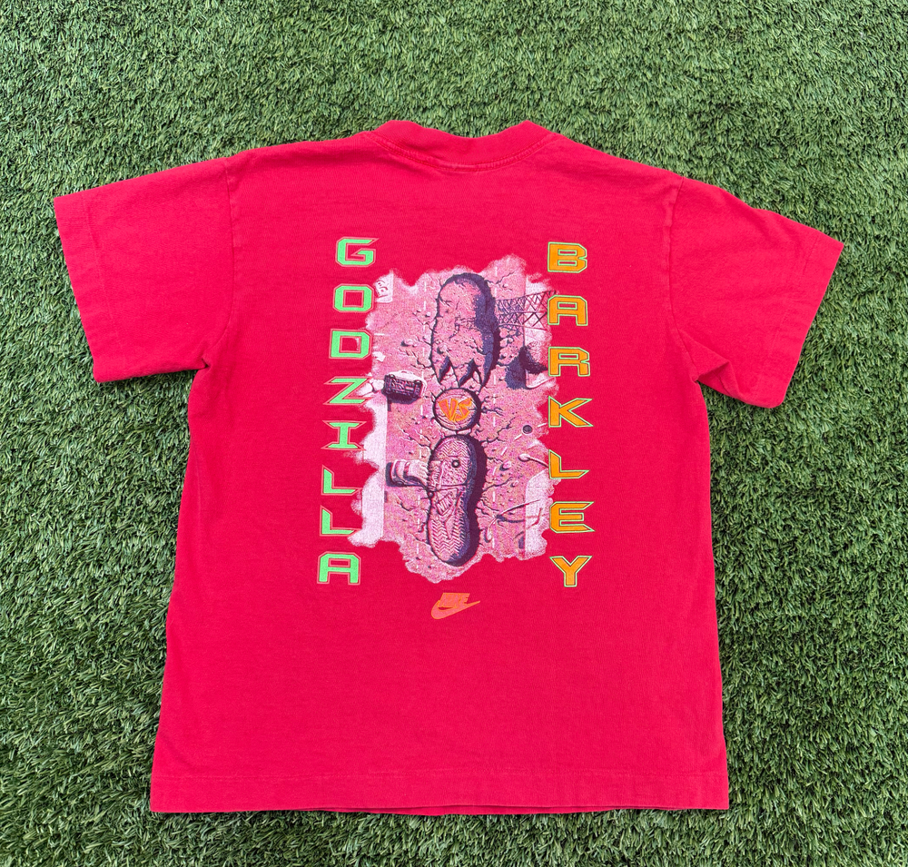 Nike Vintage Shirt Godzilla vs. Charles Barkley. This shirt accompanies the 1992 'Battle of the Century' advertising campaign Nike had running on television. Tag: missing Single Stitch. Measurements: 18 x 22 Recommended size: adult S See all images; final sale.