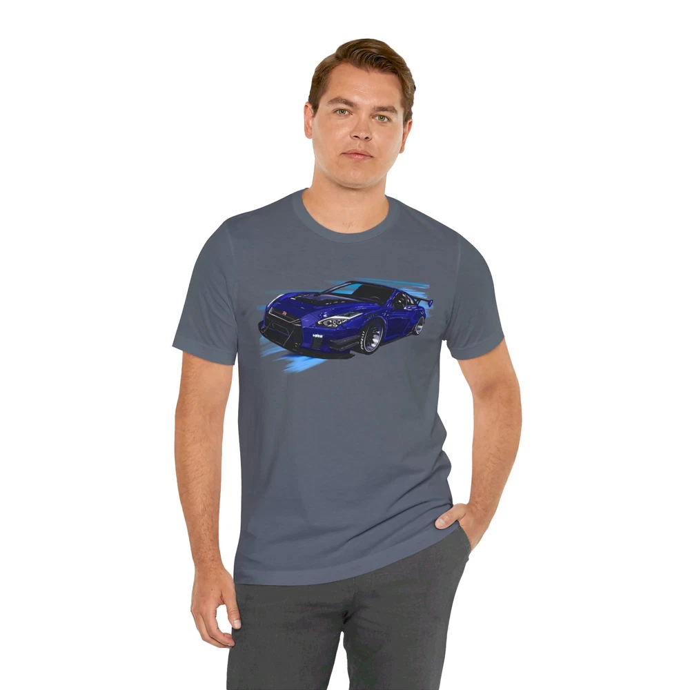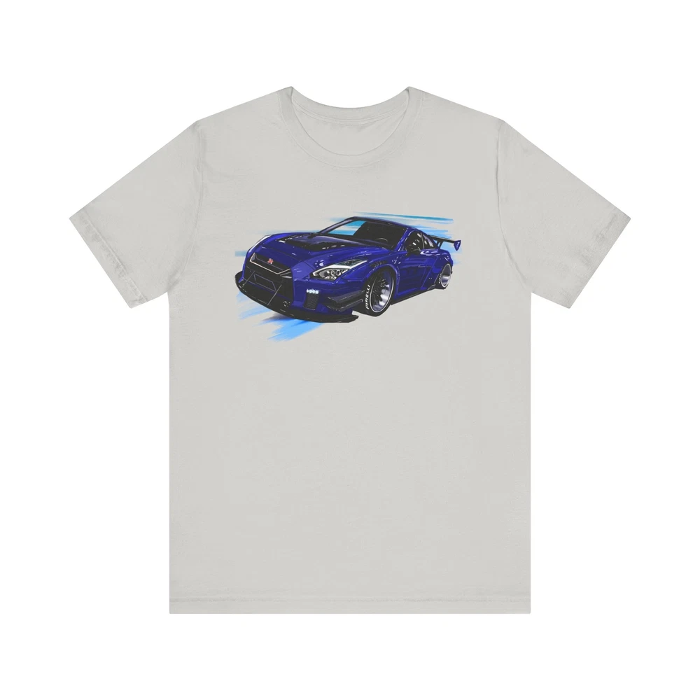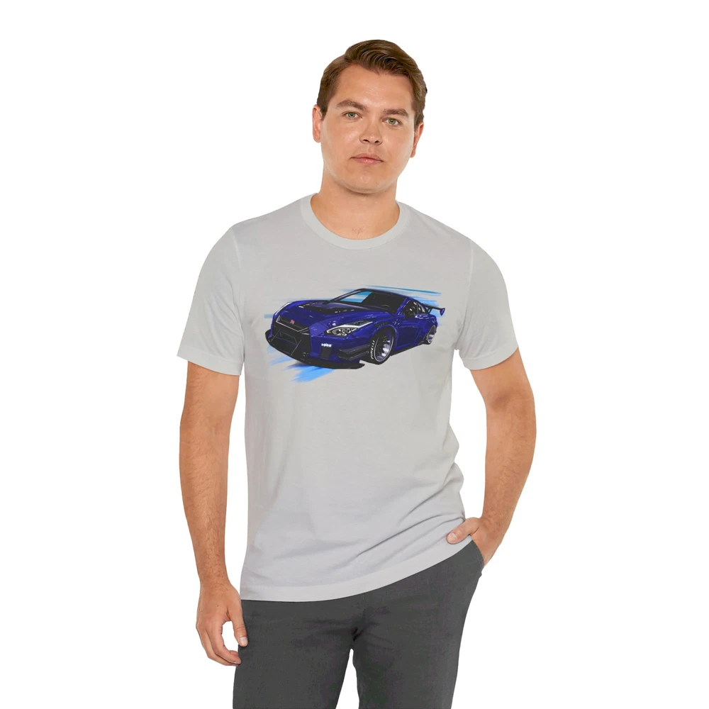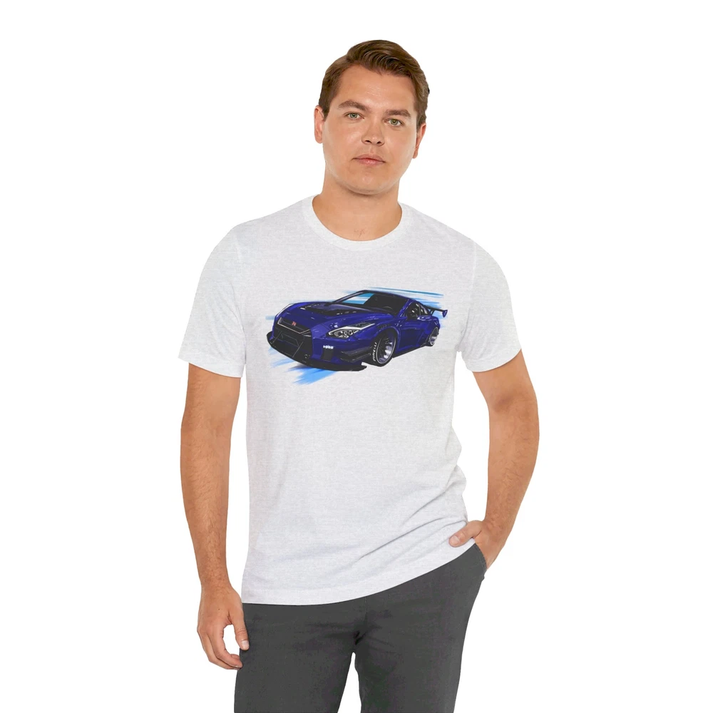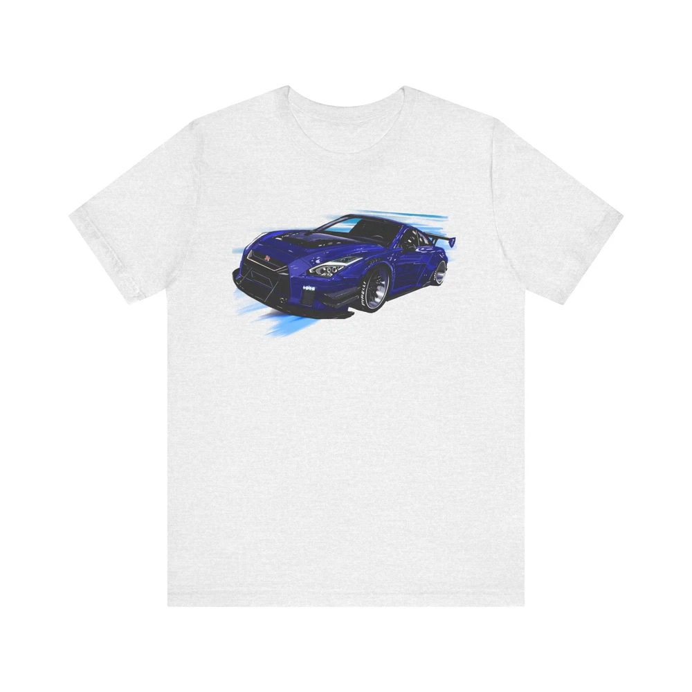 Nissan skyline R35 GT-R Unisex Jersey Short Sleeve Tee made from the artwork by automotive artist Daryl Thompson This classic unisex jersey short sleeve tee fits like a well-loved favorite. Soft cotton and quality print make users fall in love with it over and over again. These t-shirts have-ribbed knit collars to bolster shaping. The shoulders are tapered for a better fit over time. Dual side seams hold the garment's shape for longer. .: Made with 100% Airlume combed and ring-spun cotton, a lightweight fabric (4.2 oz/yd² (142 g/m²)) that is easy to layer, breathable. Perfect for active and leisure wear. .: The retail fit that is perfect for casual and semi-formal settings. The crew neckline adds a classic, neat style that's perfect for accessorizing. .: Bella+Canvas manufactures all its products in the US and internationally in humane, no-sweat-shop, sustainable way and is part of the Fair Labor Association as well as Platinum WRAP certified. .: The tear-away label minimizes skin irritations. .: Fabric blends: Ash and Heather Prism colors - 99% Airlume combed and ring-spun cotton, 1% polyester; Heather colors - 52% cotton, 48% polyester; Athletic Heather and Black Heather - 90% cotton, 10% polyester.