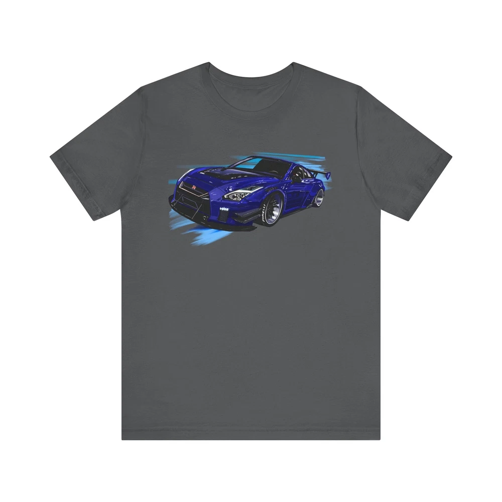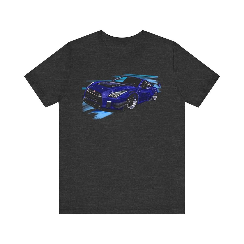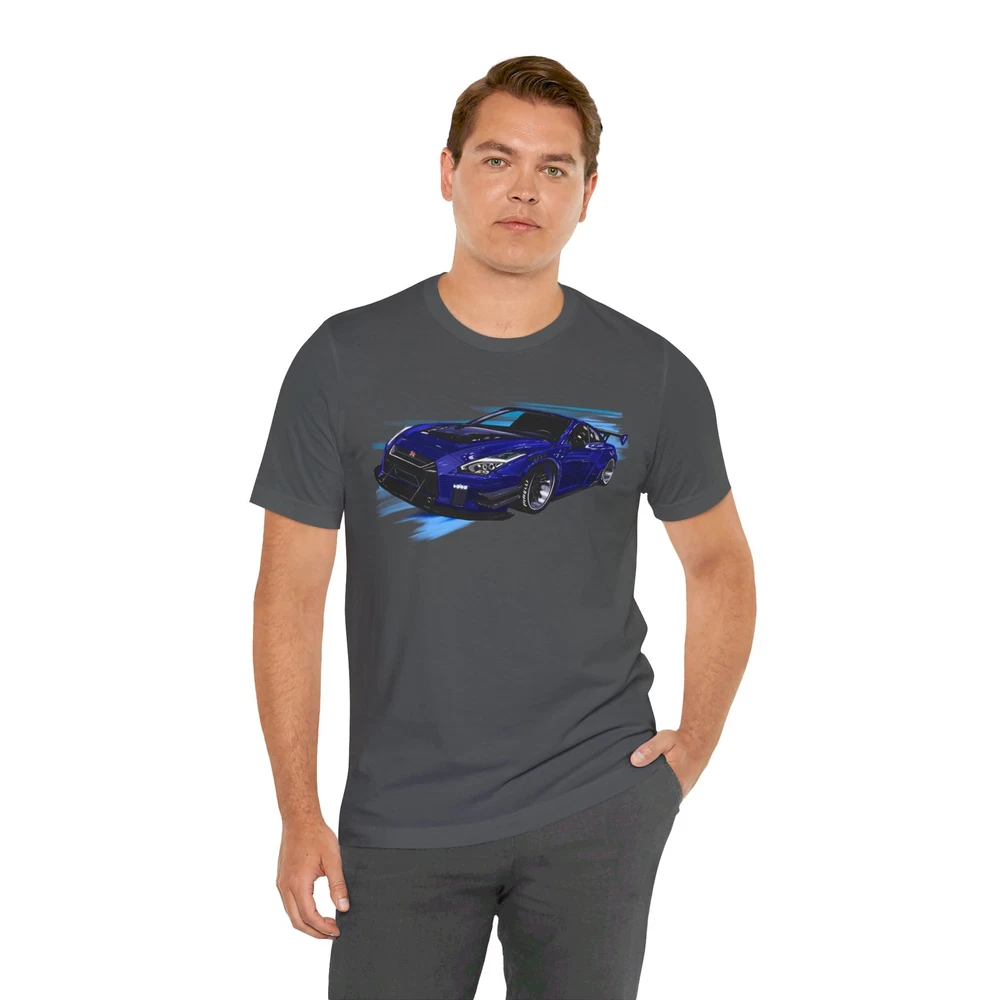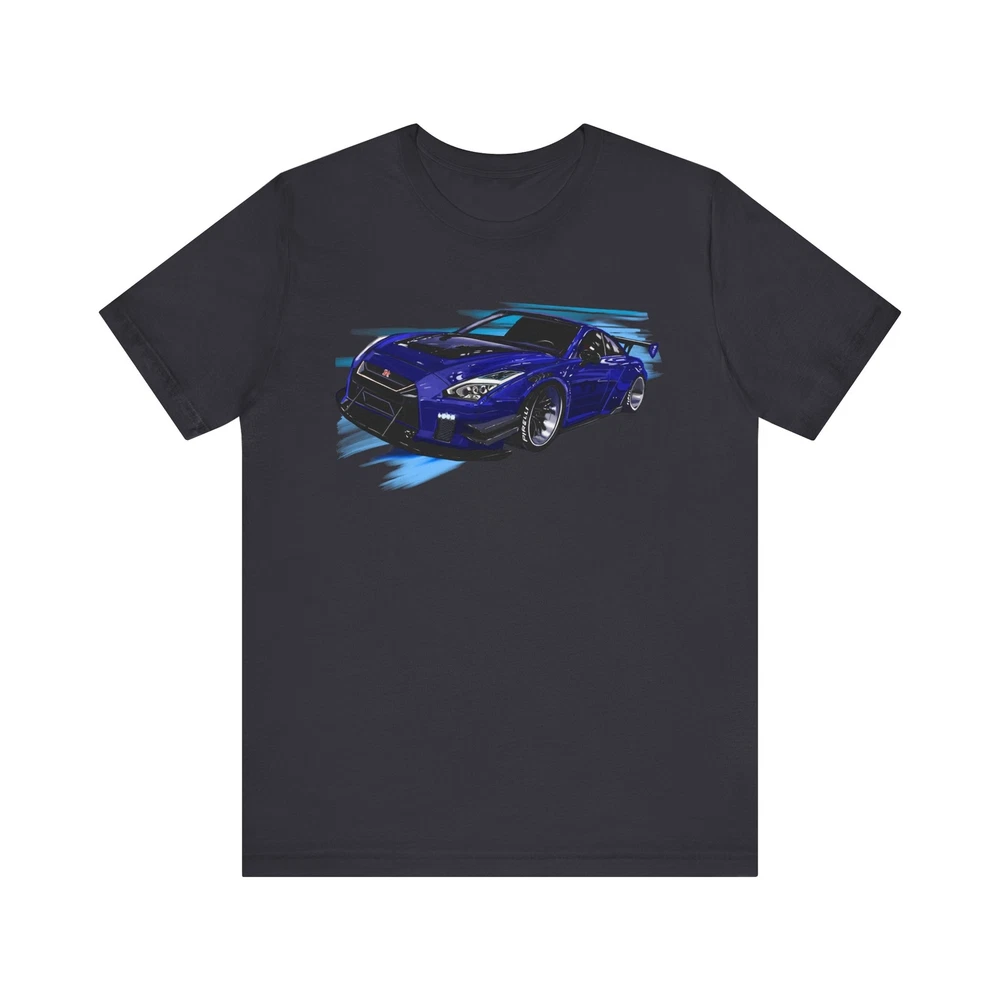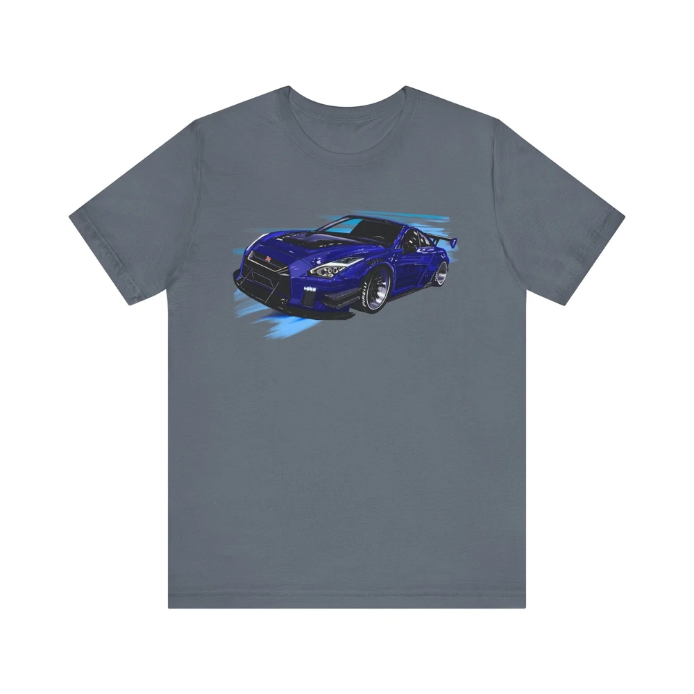 Nissan skyline R35 GT-R Unisex Jersey Short Sleeve Tee made from the artwork by automotive artist Daryl Thompson This classic unisex jersey short sleeve tee fits like a well-loved favorite. Soft cotton and quality print make users fall in love with it over and over again. These t-shirts have-ribbed knit collars to bolster shaping. The shoulders are tapered for a better fit over time. Dual side seams hold the garment's shape for longer. .: Made with 100% Airlume combed and ring-spun cotton, a lightweight fabric (4.2 oz/yd² (142 g/m²)) that is easy to layer, breathable. Perfect for active and leisure wear. .: The retail fit that is perfect for casual and semi-formal settings. The crew neckline adds a classic, neat style that's perfect for accessorizing. .: Bella+Canvas manufactures all its products in the US and internationally in humane, no-sweat-shop, sustainable way and is part of the Fair Labor Association as well as Platinum WRAP certified. .: The tear-away label minimizes skin irritations. .: Fabric blends: Ash and Heather Prism colors - 99% Airlume combed and ring-spun cotton, 1% polyester; Heather colors - 52% cotton, 48% polyester; Athletic Heather and Black Heather - 90% cotton, 10% polyester.